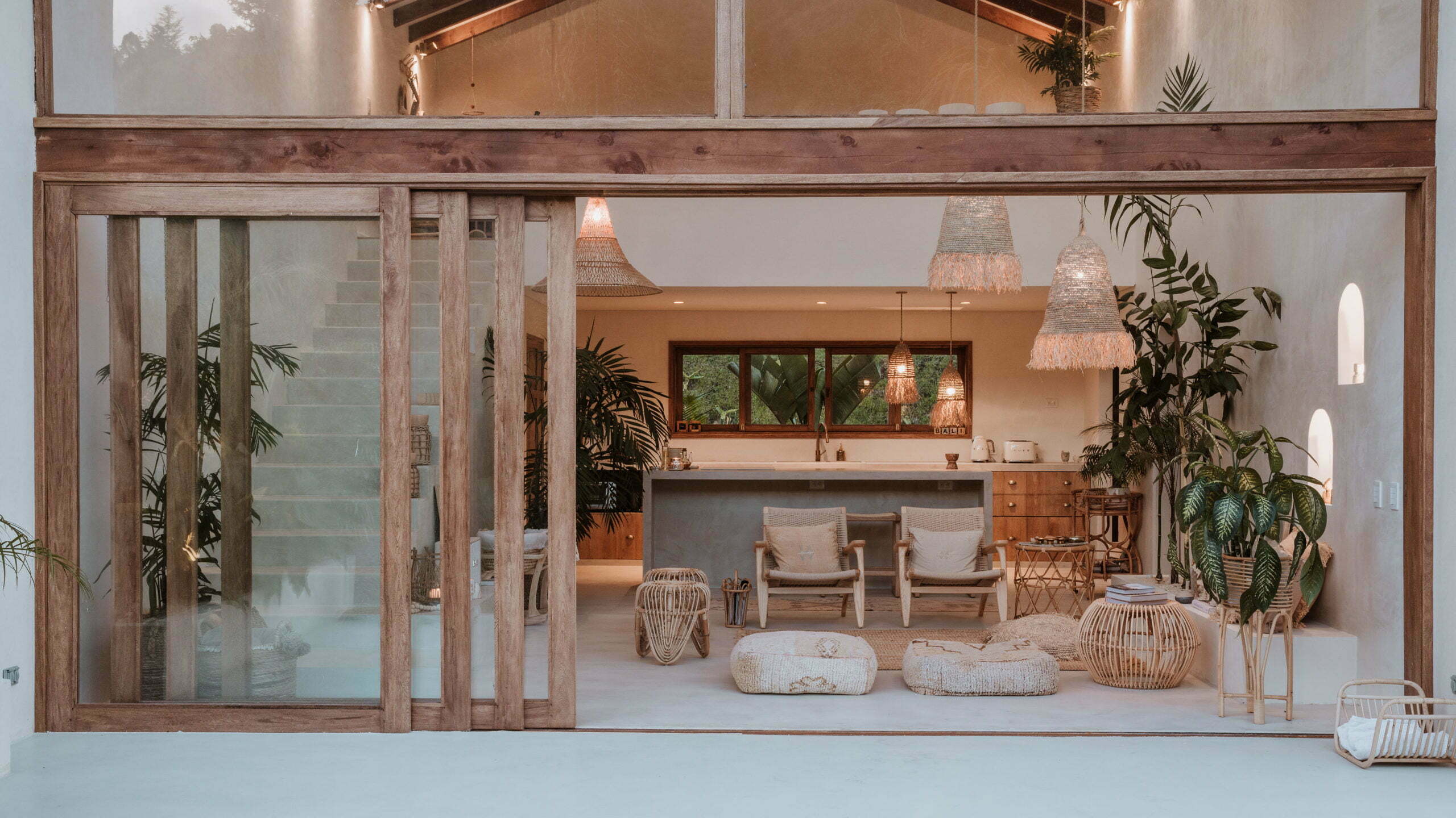 “Teníamos como referencia algunas viviendas que habíamos visto en Bali, y aunque la casa queda en El Retiro y su clima es un poco más frío, esto no implicaba que tuviéramos que hacerla totalmente cerrada”. El espacio construido, amplio, abierto y generoso en altura, goza de grandes ventanales y de tragaluces que le permiten captar el calor en el transcurso del día y hacerles frente a las exigencias del clima. Su color, crema claro, le otorga un carácter especial. “Es prácticamente un lienzo, una misma tela que se envuelve, para crear un lugar neutro y versátil”. Al combinar la omnipresencia de este tono, que aparece en las superficies de microcemento de escaleras y mesones, en los enchapes de cemento del hall principal y en la pintura de todas las demás superficies de la casa, con la transparencia que ofrecen los enormes ventanales, el ambiente refleja y se baña con la luz del sol. “Siendo ambos fotógrafos, tenemos un interés muy especial por la luz natural”.