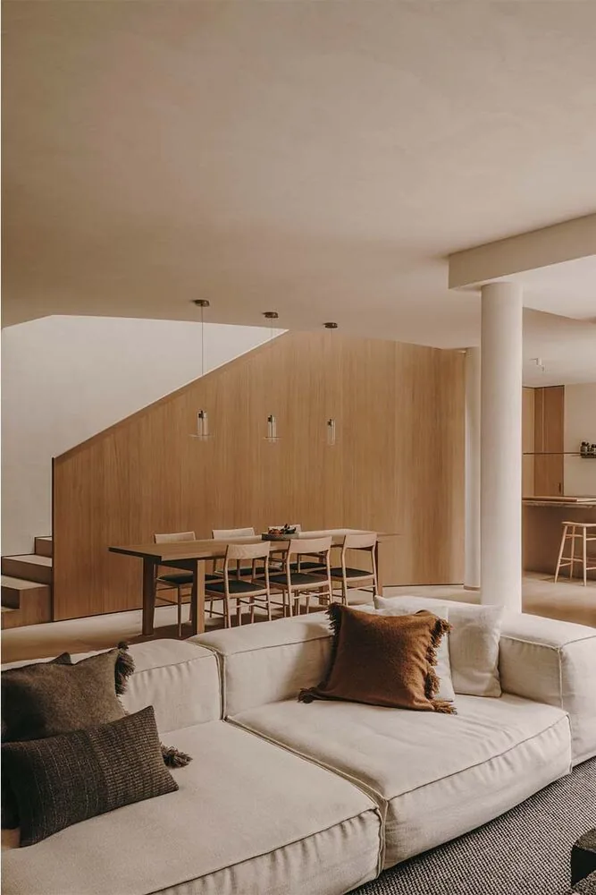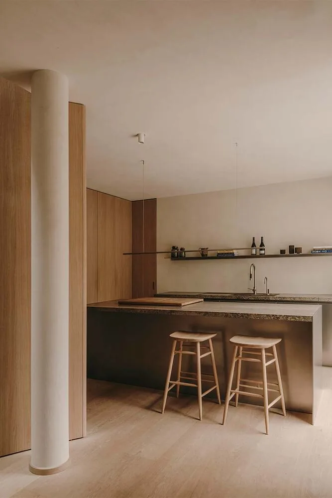 Lo primero que llama la atención es el uso de muy pocos materiales: roble, yeso, piedra y acero inoxidable en la cocina . «A pesar de su trabajo en el mundo del arte, no querían que nada perturbara la serenidad del interior: ni elementos decorativos, ni obras de arte», añade Petri .