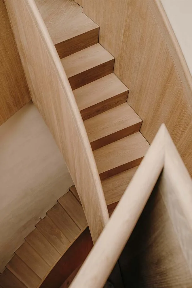 La entrada de luz natural desde arriba se convirtió en un aspecto fundamental, lo que condicionó el diseño y la forma de la escalera escultórica, que distribuye la luz por todas las plantas de la vivienda. Su madera armoniza con el elegante roble utilizado para los paneles de las paredes y el mobiliario.