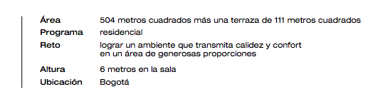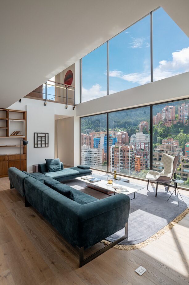 Este penthouse se ubica en los pisos 18 y 19 de un edificio en el norte de Bogotá. Esta condición genera que no tenga vecinos a su alrededor, lo cual da total privacidad y permite disfrutar una vista de 360 grados sobre la ciudad. El apartamento distribuye en los 504 metros cuadrados de sus dos pisos tres habitaciones y cinco baños, más las áreas sociales y de servicio. Parte de la propuesta de arquitectura está centrada en crear espacios cómodos que aprovechen al máximo el metraje y, por supuesto, la panorámica –de ahí el uso de ventanales de piso a techo.