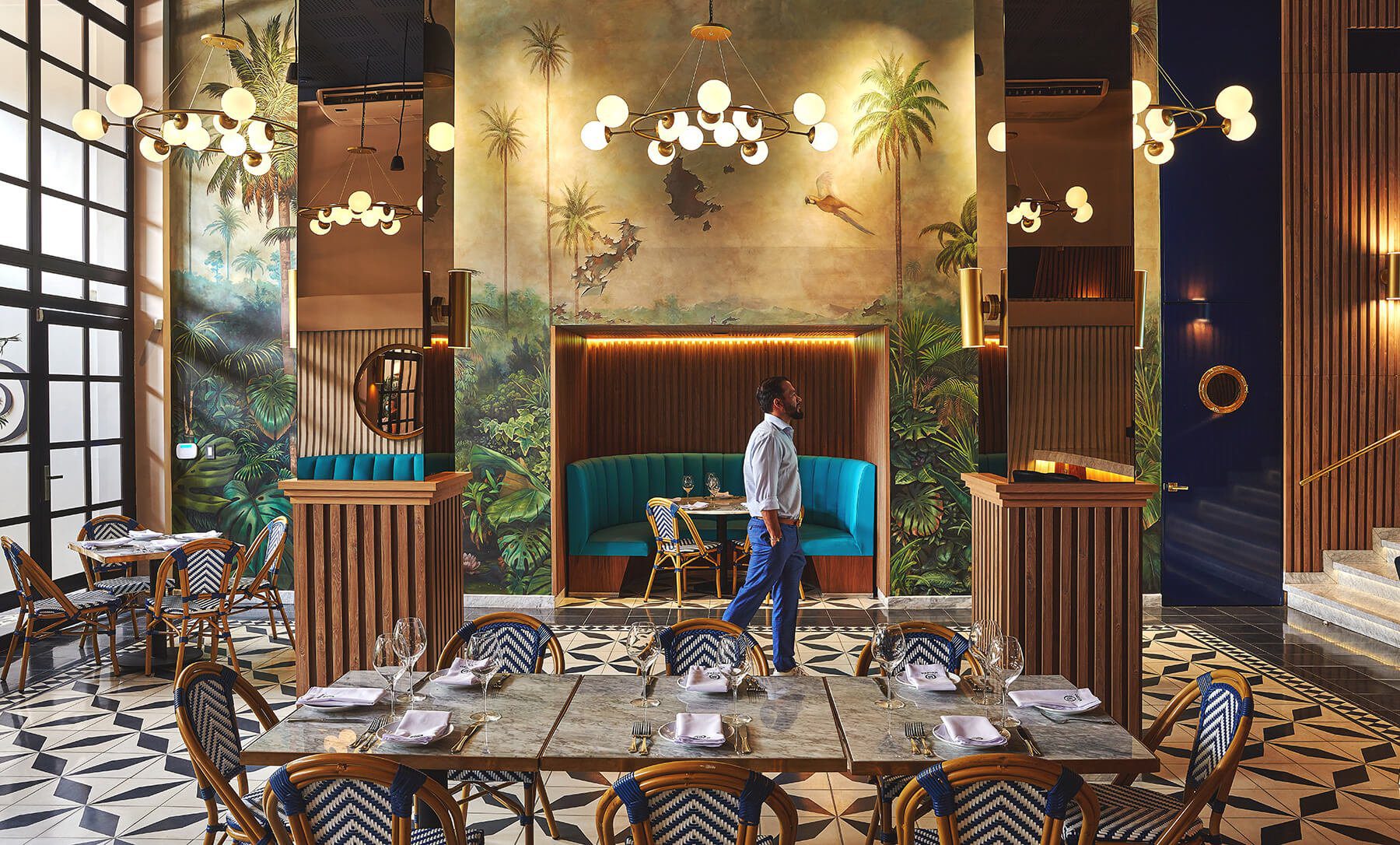 “Con este proyecto siempre estuvimos buscando un ambiente de bistró, pero yo no me sentí cómodo haciéndolo al estilo ciento por ciento francés, ya que estando en la mitad de una ciudad con tanta identidad como lo es Cali eso hubiera sido un fracaso. Por esta razón, quisimos dejar ciertos elementos tradicionalmente asociados a la idea del bistró —por ejemplo, las sillas de bistró francés y los apliques duales en bronce—, pero también añadimos ciertos elementos como la baldosa hidráulica en los pisos para contrarrestar y agregarle esa sensación de un interiorismo local”, comenta el diseñador.