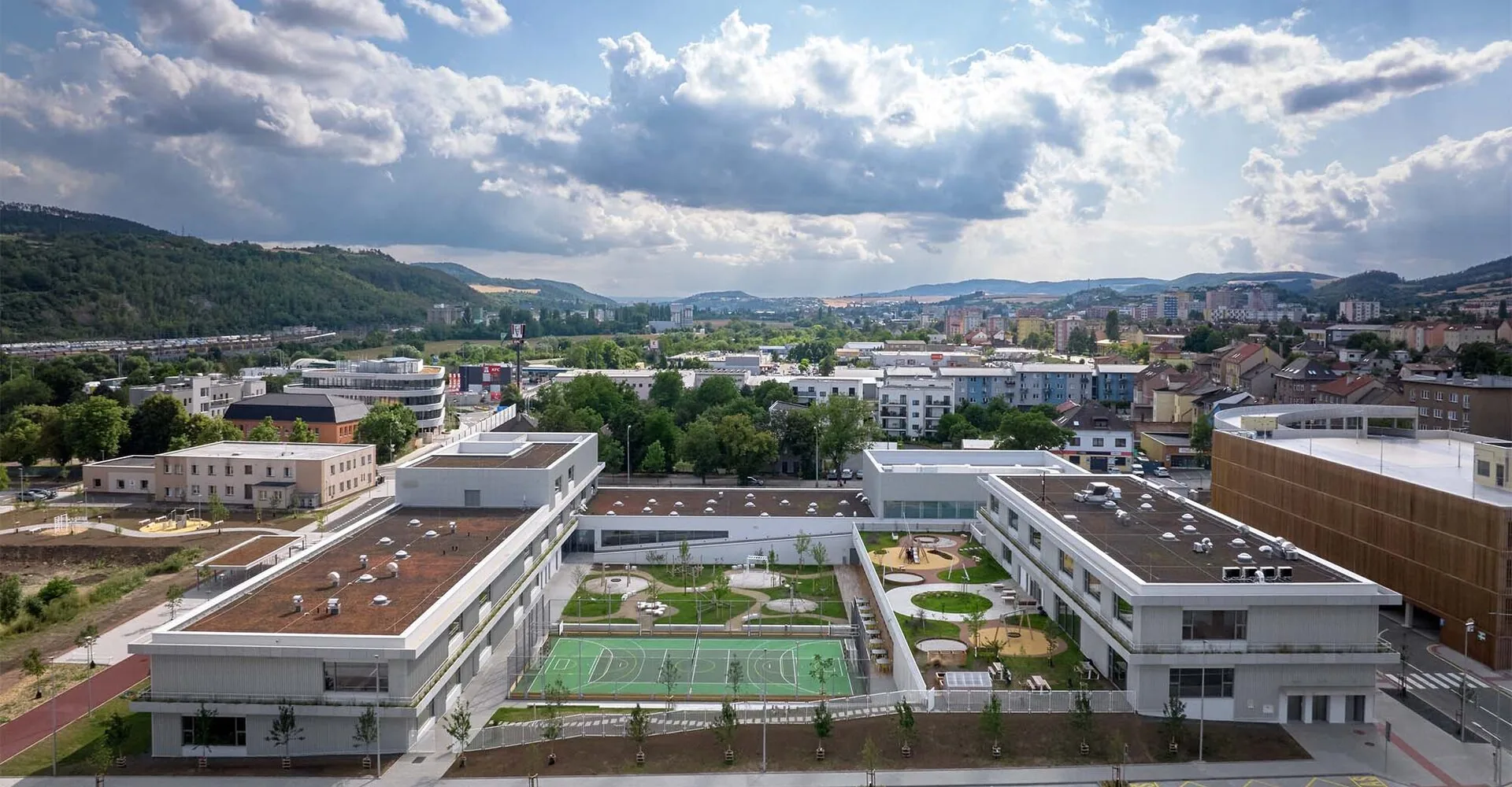 El proyecto, por la firma ÓVULO , forma parte de la primera etapa de la revitalización de la antigua fábrica textil Tiba, en una zona industrial abandonada. Con esta obra se apoya la transformación de esta parte de la ciudad en un espacio urbano animado y acogedor. El diseño del campus escolar El campus está diseñado como un edificio de tres plantas con alas dispuestas alrededor de un patio central en forma de U.
