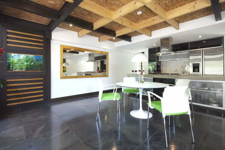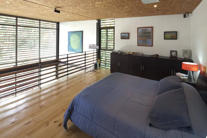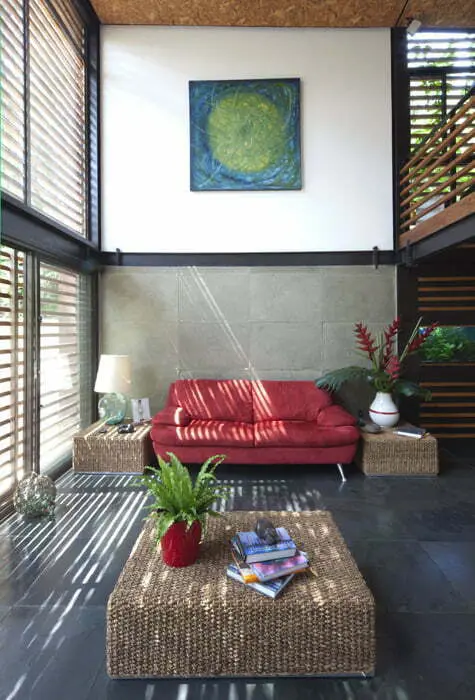 Este espacio se vincula con el exterior gracias a un enorme batiente en el costado de la lámina de acero y a que un malacate eléctrico mueve la persiana de madera. De esta forma, el salón se pone en contacto con el bosque, con la vegetación nativa y con un pequeño espejo de agua que se alimenta con el agua del nacedero del lote, gracias al cual la casa no depende del acueducto.En la decoración, la arquitectura interior ylos materiales desempeñan el principal papel, yel mobiliario se acopla con la sencillez de esos elementos que se repiten adentro para dar consistencia a la propuesta exterior de simplicidad y sencillez, de acuerdo con los requerimientos de bajo mantenimiento y durabilidad del propietario. Algunas mesas de rattan en la sala, un sofá que imprime un toque de color fuera de la paleta “naturalista” de toda la idea arquitectónica, y muy pocos objetos, armonizan con el diseño de Joe Delgado.