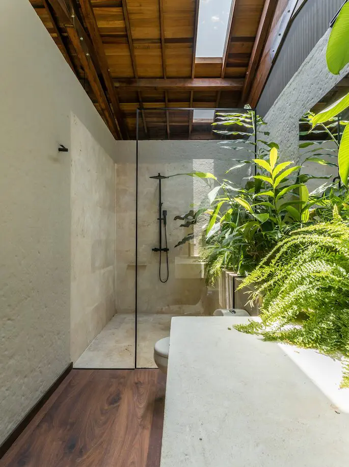 “Nos la jugamos por hacer una casa sin vidrio”, recuerda su arquitecto. Tampoco incluyeron aire acondicionado para apostarle a una estrategia totalmente sostenible. Es así como aprovecharon las alturas de las cubiertas a dos aguas para tener ventilaciones cruzadas en la parte superior de los espacios, y diseñaron persianas en las puertas y ventanas que, protegidas con anejos posteriores, permiten el paso del aire y dejan afuera los insectos. También incorporaron sobre el techo una serie de paneles fotovoltaicos que sirven de apoyo en la generación de la energía que requiere la vivienda para su funcionamiento.