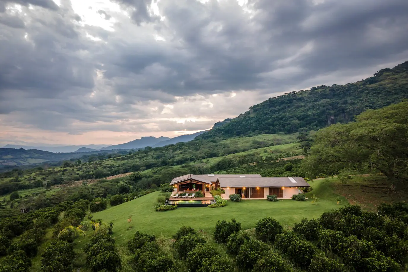En un paisaje homogéneo, los arquitectos hallaron dos enormes árboles centenarios –piñones de oreja–, muy característicos de la zona, y decidieron posar la vivienda a su lado. “La casa se podía hacer prácticamente en cualquier lugar del naranjal –comenta Arango–. La presencia de estos fue el pretexto perfecto para armar un espacio y utilizarlos como preámbulo”. El acceso vehicular pasa entre ellos como antesala, para encontrarse finalmente con el edificio construido. Su diseño, inspirado en el clásico hogar antioqueño con corredores, se percibe sobrio, abierto e integrado con el entorno natural.