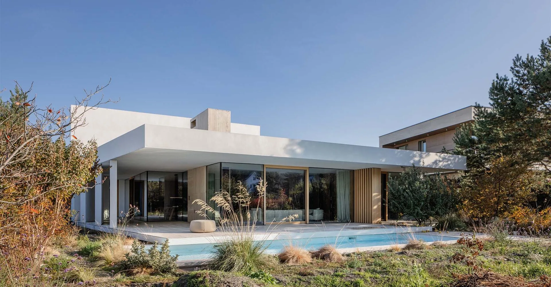 La disposición de los espacios alrededor de la casa, respetando el ciclo solar, ha convertido la parte oriental de la terraza en un lugar ideal para disfrutar de un café por la mañana, mientras que las zonas occidental y sur conforman la terraza principal con piscina. La composición horizontal de la casa se complementa con un pabellón en la azotea, que alberga una zona de bienestar y ofrece vistas al lejano castillo de Pajštún.