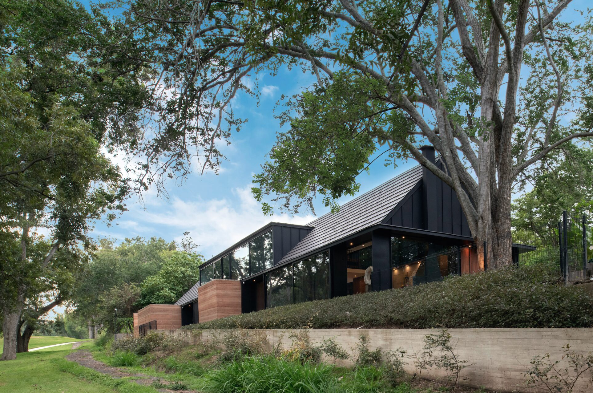 Buscando el equilibrio entre las vistas inspiradoras y la privacidad del cliente, el arquitecto diseñó un esquema en forma de L, con el volumen principal de la residencia, revestido de acero y vidrio, sirviendo como una barrera entre las áreas privadas de la residencia y el campo de golf adyacente.