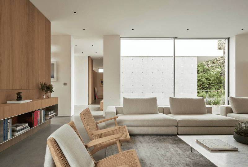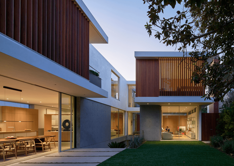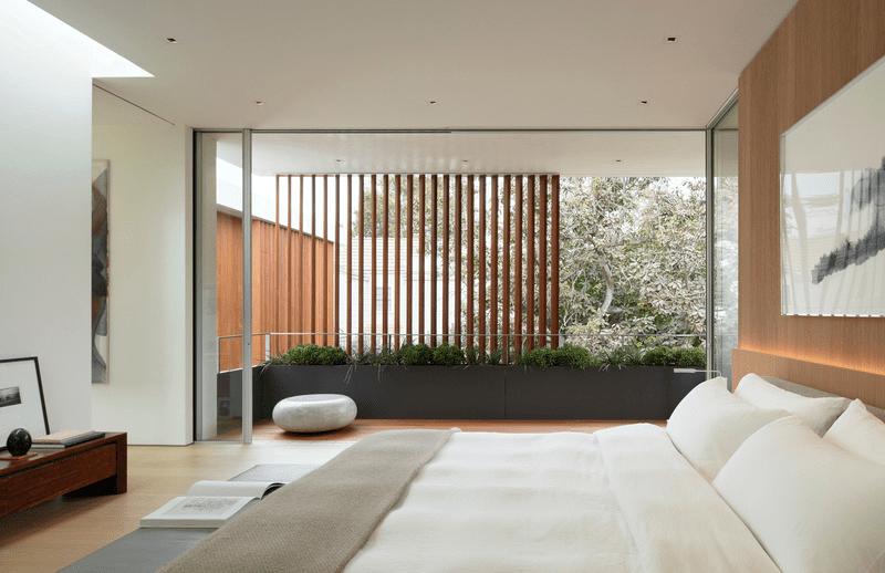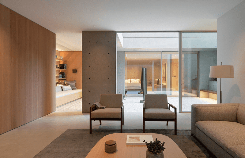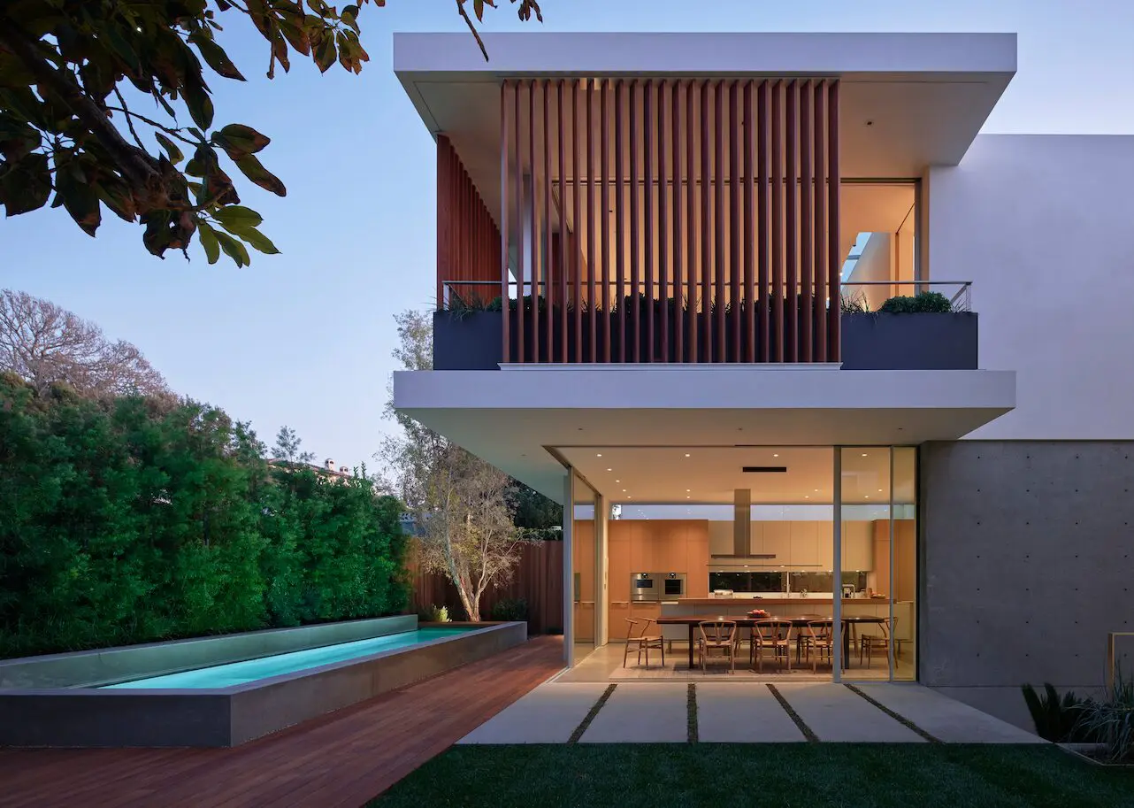 La casa se centra en el patio vertical que conecta los tres niveles de la vivienda, junto con los jardines adyacentes en terrazas, para crear momentos de simplicidad y poesía dentro de la residencia. El patio de tres pisos hace pasar la luz por cada una de las plantas, incluido el sótano, al tiempo que proporciona privacidad hacia el interior y líneas de visión hacia el patio trasero. Una serie de pantallas móviles difuminan aún más los límites entre el espacio interior y el exterior y ayudan a articular una fachada mínima, mientras que el zócalo de hormigón de los niveles inferiores actúa como el ancla a partir del cual se unen todos estos elementos.