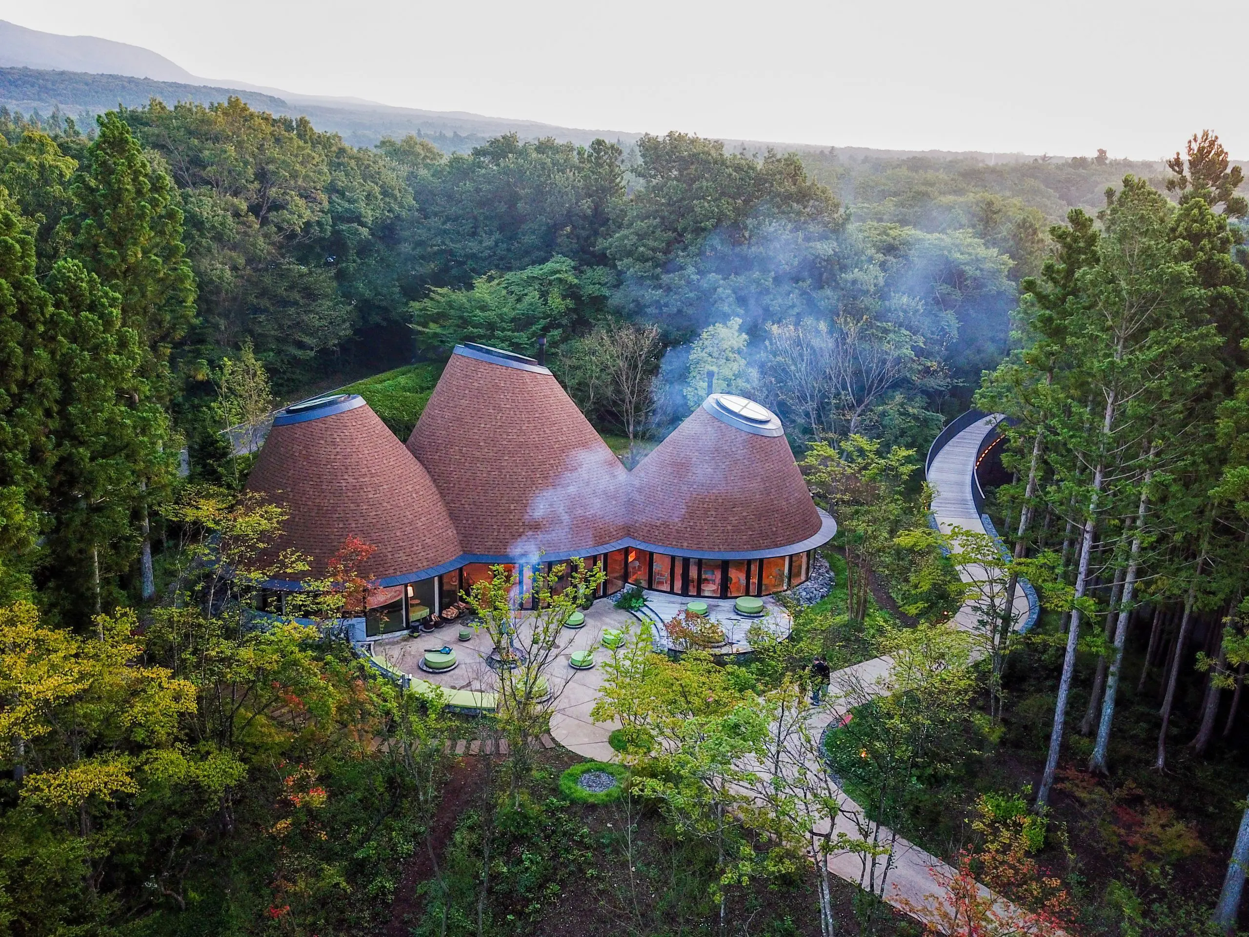 Definen la construcción tres volúmenes de planta circular con techos cónicos que destacan sobre el fondo del bosque circundante. El cuerpo central es el más grande y contiene la zona comunitaria, que gira en torno a un horno para pizza. Afuera aparece una huerta donde crecen vegetales disponibles para este espacio. En el segundo hay un área de descanso para los adultos, con amueblamiento distribuido alrededor de una chimenea central.