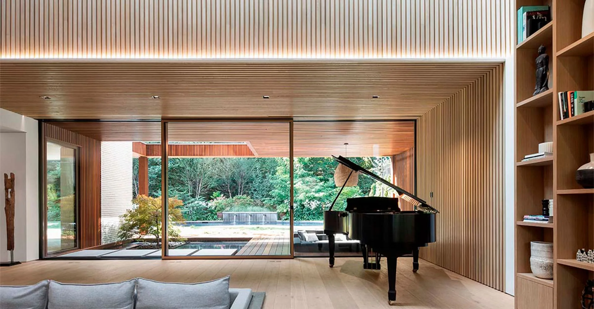 El diseño original de esta casa , hecha por la firma Atelier Chardonnat et Salem Architecture , se inspiró en la obra arquitectónica de Frank Lloyd Wright. Esta importante transformación y ampliación busca honrar la esencia histórica, a la vez que crea un remanso de paz en Mount Royal (Canadá). Las intervenciones rinden homenaje a este icónico arquitecto e integran influencias japonesas y escandinavas, muy apreciadas por los propietarios. El resultado es un espacio habitable espacioso y acogedor, conectado con la belleza natural del bosque circundante. Las modificaciones a la fachada principal de la vivienda resaltan las líneas horizontales de la arquitectura original. Si bien las áreas ampliadas aumentan significativamente la superficie inicial, las intervenciones se integran a la perfección, buscando la armonía con los vecinos. El volumen añadido se ubica en la parte trasera para mantener las proporciones y el encanto original de la fachada que da a la calle. Una claraboya lineal separa el volumen existente de la ampliación, inundando el espacio habitable con luz natural difusa. El nuevo diseño de la casa La fachada trasera acristalada, establece una sólida conexión con el paisaje exterior y los árboles de la montaña. Esta simbiosis se ve reforzada por la disposición vertical de listones de madera de IPE colocados para crear un ritmo distintivo y un equilibrio visual. Los elementos exteriores de madera se extienden al interior, dando paso a la madera de roble. La frontera entre el interior y el exterior se difumina gracias a esta continuidad de materiales naturales. La casa presume de amplios techos de pizarra en voladizo, que se integran a la perfección con la piedra, el ladrillo claro y el cobre estañado existentes. El componente esencial del proyecto ha sido diseñado para crear un jardín zen con influencias japonesas. El agua también juega un papel central, apareciendo en diversas formas: tranquilos estanques que marcan el acceso a la entrada principal y la transición hacia la zona de estar exterior, así como una fuente en el patio lateral. Además, en esta obra el agua contribuye a la serenidad general del ambiente, reflejando la luz y evocando sonidos relajantes. Además, las piedras de río contribuyen a esta sensación de tranquilidad, mientras que la sustitución del césped convencional por tomillo realza el atractivo único del paisaje. En el interior, una armoniosa combinación de diversos materiales naturales como roble, nogal, piedra, mármol y madera quemada Shou Sugi Ban crea una elegante unidad. El techo y los suelos, sin zócalos ni molduras, crean una elegancia etérea. Las puertas integradas realzan aún más este aspecto depurado, mientras que el juego de líneas rectas y sinuosas revitaliza el espacio. Cada intervención en esta obra maestra arquitectónica fusiona a la perfección los principios del diseño de mediados de siglo con influencias japonesas y escandinavas, estableciendo así una profunda conexión con la naturaleza. El resultado se manifiesta en una residencia moderna y acogedora que infunde bienestar gracias a la sutileza de las decisiones del equipo de diseño y la meticulosa ejecución de cada detalle.