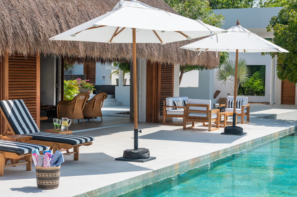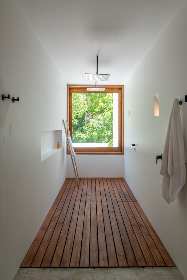 La zona social está definida como un volumen suelto con una cubierta de paja. Este espacio disfruta de una gran altura, lo que contribuye a mantener fresco el ambiente. A su vez, se integra con la piscina mediante puertas corredizas de madera y vidrio. En el centro del patio aparece una sala cubierta, que con pocos muros se convierte en una pausa en medio de la circulación. Las habitaciones están agrupadas en una construcción de dos niveles. Abajo, tres alcobas y un salón de estar se disponen de manera lineal, enfrentados a la vegetación cercana. Arriba, una oficina ubicada entre dos patios y la recámara principal, que se abre con una terraza que conduce la mirada al mar por encima de las copas de los árboles.