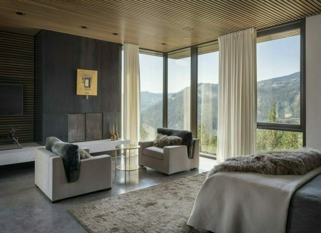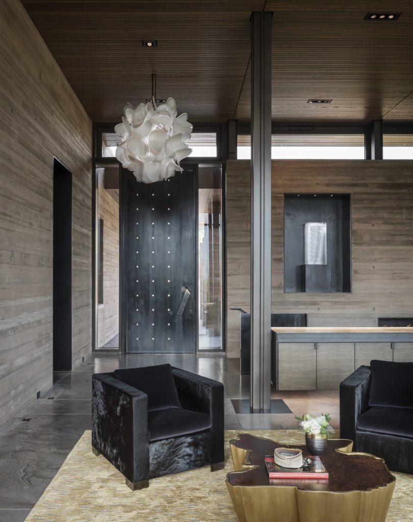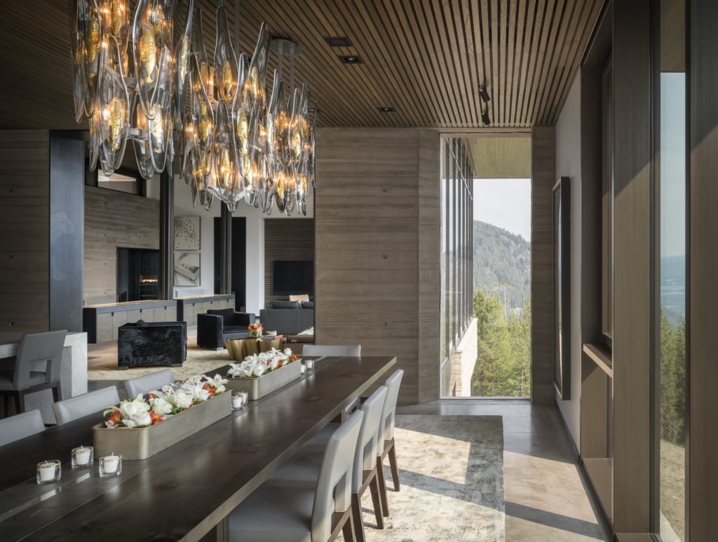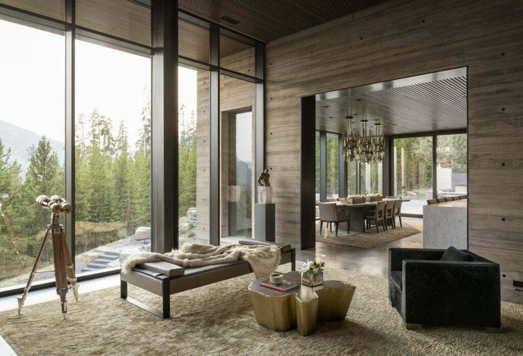 En el interior la paleta es mínima y se centra en materiales y acabados naturales. “Este proyecto fue una rara oportunidad de trabajar con un cliente que tiene buen ojo para el diseño de alto nivel y detalle”, señala la diseñadora de interiores Julianne Shaw, miembro del equipo. “Mi objetivo era crear espacios pensados para los propietarios. Con el fin de lograr esto trajimos los colores del paisaje de Montana, usamos piedra natural en todas partes y agregamos muebles refinados, telas lujosas y alfombras de seda”.