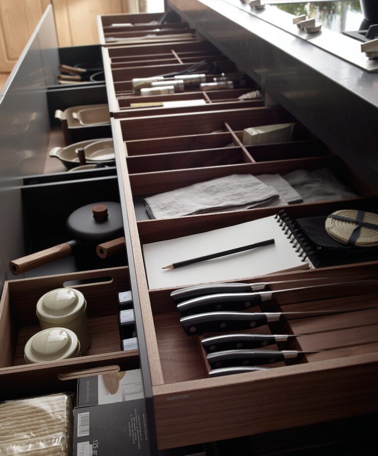 El mobiliario diseñado por Santos presenta un estilo de corte clásico, muy característico de las cocinas tradicionales, pero con un toque que lo adapta a las necesidades y hábitos de hoy. La isla, centro de atención de este ambiente, incorpora a las zonas de lavado, preparación y cocción una barra auxiliar complementada con taburetes Steelwood, de la firma Magis, y múltiples y accesibles soluciones de almacenaje. Los cajones del nivel superior, de madera de nogal, tienen una base modular sobre la que pueden ubicarse accesorios como, por ejemplo, cubierteros, especieros, portacuchillos, portarrollos, recipientes, etc. Por su parte, en las gavetas inferiores es posible guardar ollas, sartenes, bandejas o platos, entre otros.