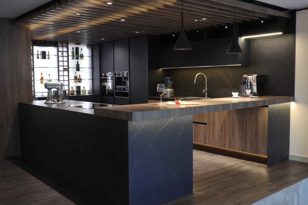 “Para el diseño de esta cocina apuntamos a un estilo moderno y elegante, así que decidimos inclinarnos por una gama de colores oscuros que le dieran un aire sofisticado, mientras incorporábamos la tendencia de las cocinas abiertas con el fin de lucir desde un primer vistazo la combinación de texturas, tonos y acabados que se aplicaron en sus superficies”, explican desde la firma DC Mobiliario, en Cali, Valle del Cauca.