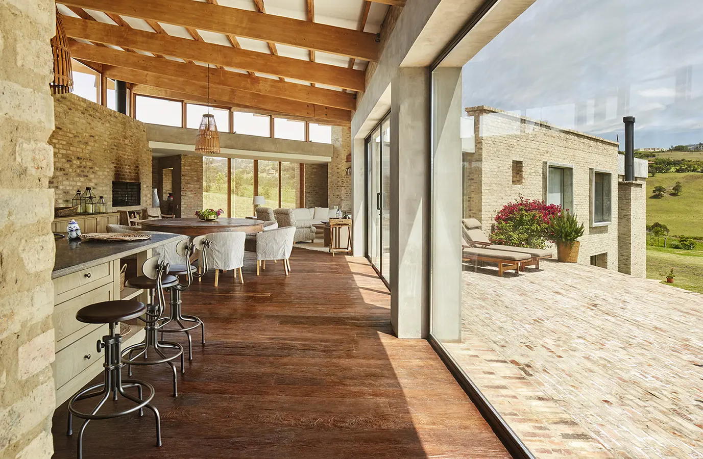 Salón, comedor y cocina se suceden en un solo espacio, integrado, lineal y continuo, que goza de la vista ininterrumpida del paisaje gracias a los enormes ventanales de piso a techo que le dan frente. Y es que, contrastando con la fachada hacia el acceso, cerrada, controlada e íntima, la cara hacia el oriente se abre completamente para fundir los ambientes interiores con el exterior. Un poco más allá aparecen las habitaciones, un tanto más resguardadas, pero también orientadas y dispuestas para aprovechar la vista. La cubierta, diseñada a una sola agua y compuesta por una serie de vigas de madera, abarca ambas alas de la casa y enfatiza la linealidad del diseño. Dilatada de los volúmenes que la sostienen, aparece flotando ligera sobre toda esta sucesión de espacios.