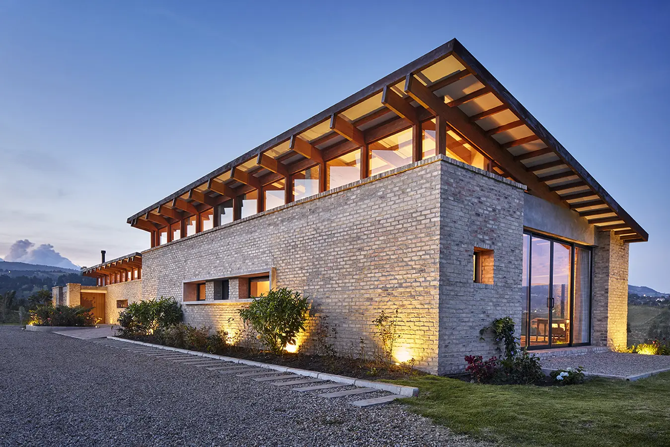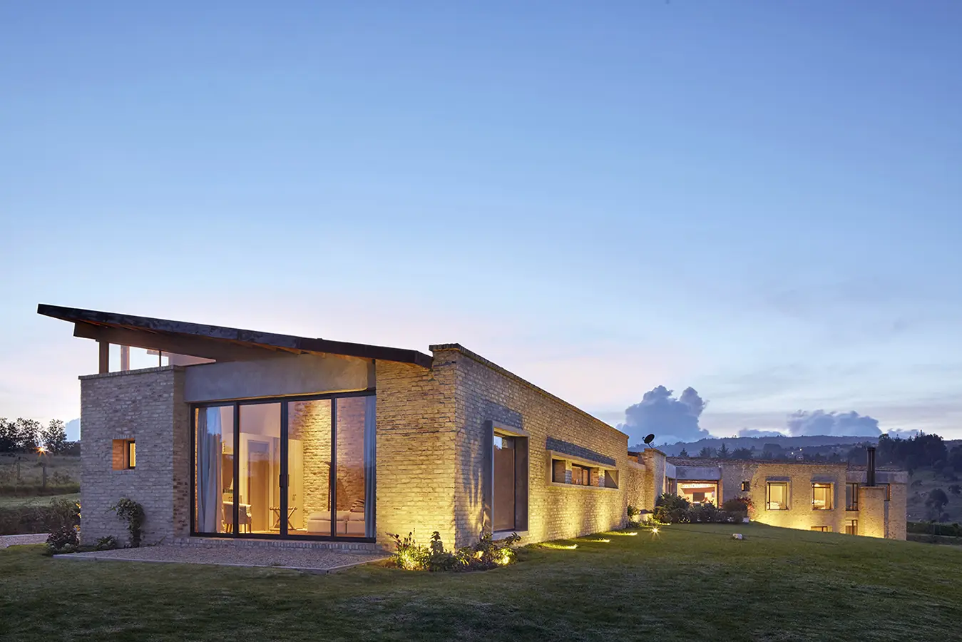 La construcción se posa en la parte más alta del terreno, el costado suroccidental, aprovechando las amplias visuales sobre la sabana, abarcando con un solo golpe de vista la silueta de las montañas y disfrutando del lejano skyline de Subachoque, con las cúpulas de sus iglesias y su arquitectura colonial. La fachada que da frente al acceso, de carácter masivo y cerrado, compuesta por cinco tipos de ladrillo, ofrece variaciones en su traba –celosías, colores, texturas, cambios en los plomos y aperturas controladas–, generando un juego dinámico de luz y sombra al transcurrir el día, y un sentimiento de expectativa frente a lo que se puede encontrar al entrar.