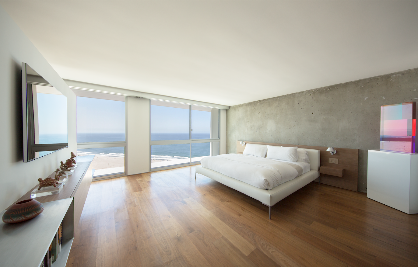 El estudio se convirtió en la habitación de invitados mediante una gran pared deslizante que abre la zona de estar de la habitación de invitados al espacio principal. Los dos dormitorios se combinaron en un gran dormitorio principal, lo que contribuyó a crear una planta abierta y contemporánea. El vestidor se reubicó en el dormitorio principal y la división del armario que daba a la cama se mantuvo más baja y se utilizó para la distribución de audio y luz en la parte superior, así como para un mueble de diseño personalizado y un soporte para la televisión frente a la cama.