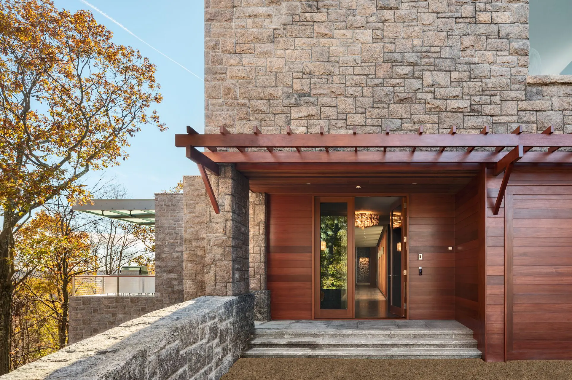 Revestida con un granito local de color salmón y gris, con un techo verde y ventanas de caoba con vidrio no reflectivo, la casa se mimetiza con su entorno desde la distancia. Al llegar a un camino de entrada sinuoso, la casa se coloca en un estante de roca natural, lo que permite un plan en forma de L que envuelve un jardín de rocas interno y la entrada al nivel del espacio habitable; áreas de cocina, comedor y sala de estar. El vestíbulo de entrada, revestido con paneles de madera recuperada, se abre a un vestíbulo que da al jardín. Un dosel de vidrio esmerilado en voladizo se extiende sobre la terraza para permitir la vida al aire libre en condiciones climáticas adversas. El nivel inferior incluye todos los dormitorios y espacios privados, cada uno con una terraza privada con vista al bosque.