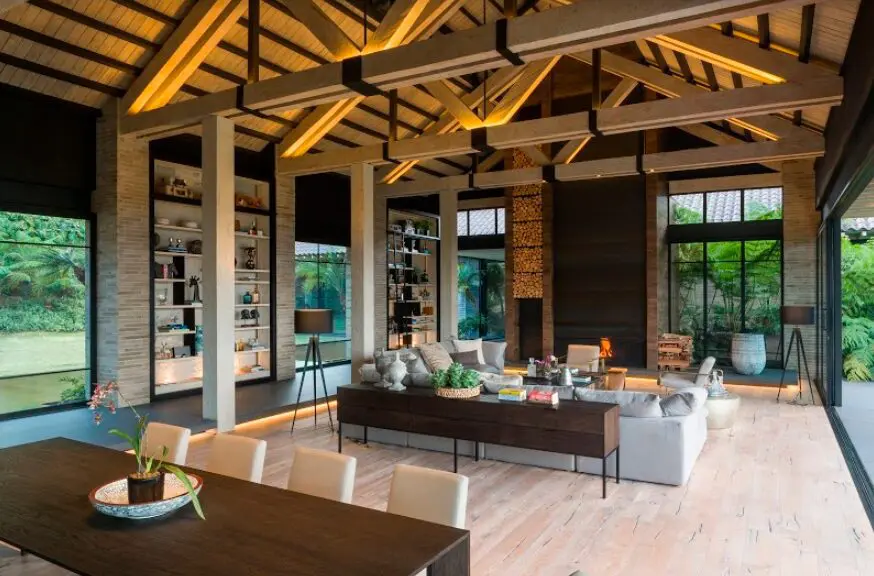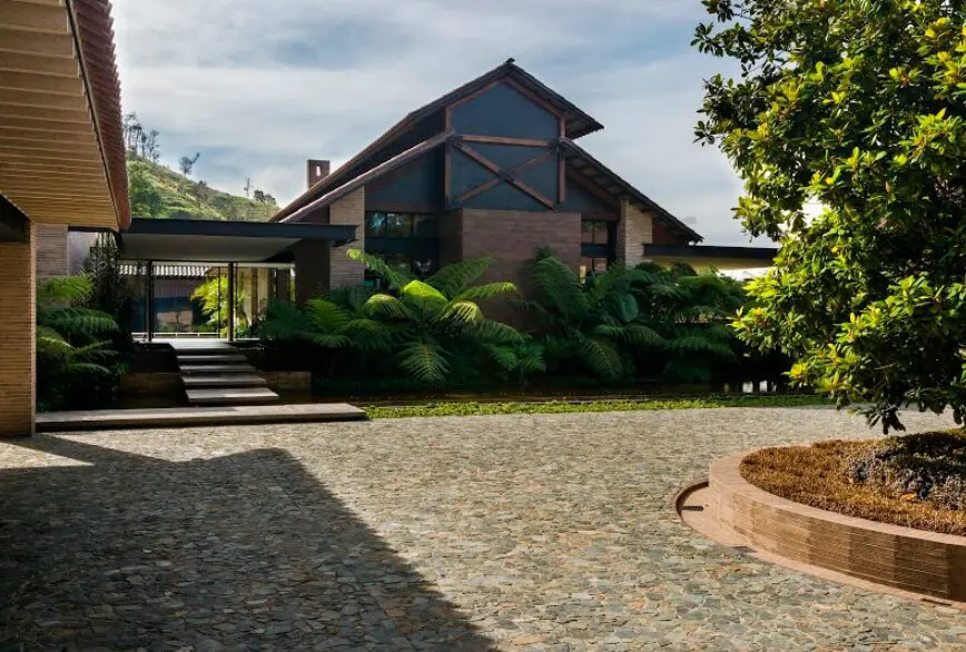 La idea de promenade –caminata o paseo– propia de la arquitectura moderna del siglo XX es el hilo conductor de las vivencias en esta residencia. La casa asume formas vernáculas, pero las combina con principios modernos. Se construye con los materiales que están a la mano, pero se les dispone de manera tecnificada y sofisticada. El ladrillo a la vista de gran formato, la madera expuesta en las estructuras de la cubierta y el vidrio de las fachadas coexisten en un collage