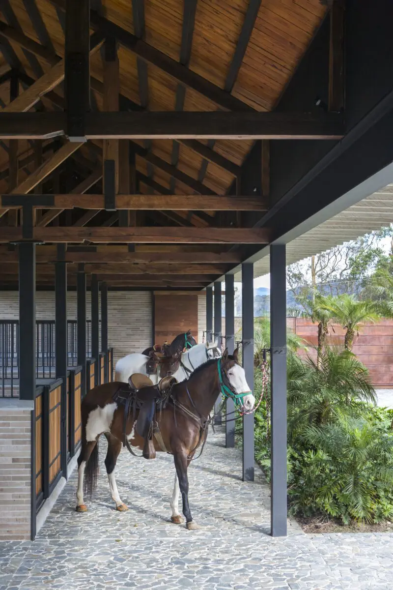 Con una zonificación clara, el acceso conduce al vehículo a un primer patio en torno a una rotonda, delimitada por un alojamiento para los mayordomos, un parqueadero cubierto y pesebreras. Llegar a la casa pone a los habitantes y visitantes en contacto con un espacio abierto que huele a naturaleza y donde la lluvia, el sol y el viento pueden entrar sin restricciones.