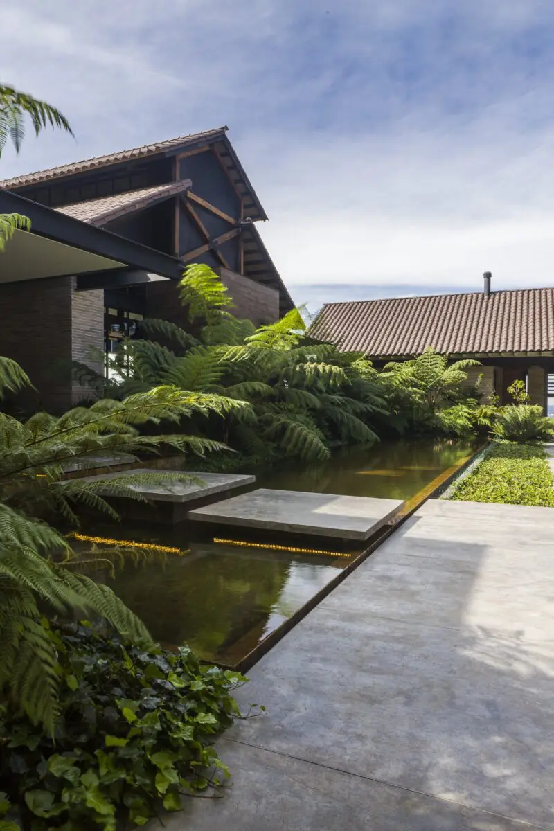 Las aguas naturales presentes en el lugar forman parte del diseño. Están canalizadas para convertirse en espejos de agua que recorren los distintos ambientes y se complementan con jardines específicos que articulan los espacios del hogar. Caminar por la casa, atravesarla y moverse casi entrando y saliendo de ella, se traduce en un rito particular de su habitabilidad.