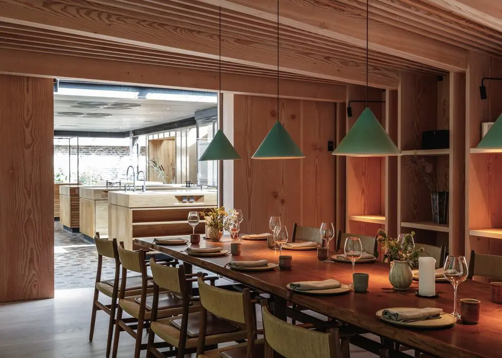 La cocina está diseñada como un panóptico con una capucha de gran tamaño que se cierne sobre los chefs. Desde aquí, los chefs pueden supervisar toda la cocina y las áreas para huéspedes, incluido el comedor y el comedor privado contiguo. Estos espacios están hechos de tablones de madera apilados que se asemejan a la madera cuidadosamente apilada en un patio de madera.