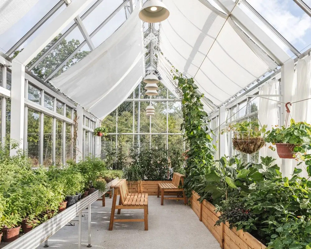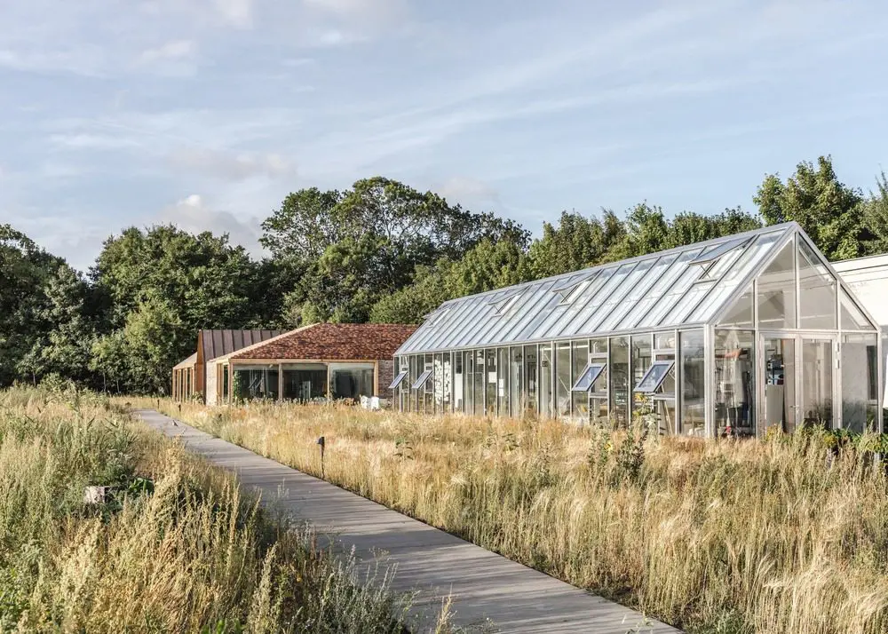 Una gran claraboya y un amplio conjunto de ventanas que se deslizan para revelar el exterior permiten a los huéspedes sentir verdaderamente todas las estaciones y los alrededores naturales del restaurante. En el exterior, tres casas independientes de vidrio proporcionan el jardín del restaurante, la cocina de prueba y la panadería.