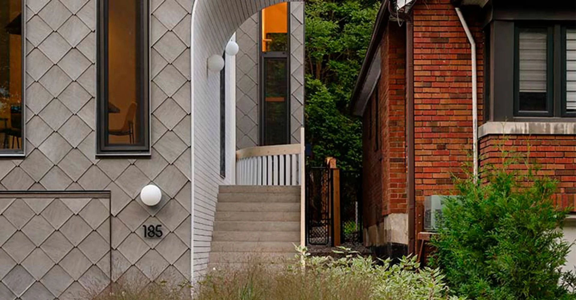 En un terreno inclinado en el extremo este de Toronto, Canadá, esta casa unifamiliar de cuatro dormitorios se encuentra enclavada en una hondonada con pronunciadas pendientes que suben hasta el patio trasero y dan al otro lado de la calle. El estudio canadiense Reigo & Bauer diseñó esta construcción desde cero utilizando maniobras geométricas para aprovechar al máximo la estrechez del terreno y crear una estructura atractiva. La forma alta y vertical del edificio evoca los viejos árboles que se alzan sobre las casas a medida que ascienden por las colinas a ambos lados. Su exterior está revestido casi en su totalidad con tejas grises en forma de diamante, que se extienden desde los muros sobre la puerta del garaje y el tejado, creando un volumen coherente. Una parte de la envolvente se ha recortado en el lado sur, lo que permite la instalación de escaleras que conducen a la puerta principal y ventanas adicionales en los laterales de los ventanales formados por este retranqueo parcial. Estas se orientan entre sí, en lugar de dar a la propiedad vecina, y aportan mucha más luz al centro de la casa, cumpliendo con las restricciones urbanísticas. Una parte del alzado sur se encuentra retranqueada respecto a la fachada principal y se realza con paneles de hormigón blanco que se extienden hasta la línea del tejado y se curvan sobre los escalones de entrada, protegiendo así el acceso desde la fachada principal. Detalles en el diseño de la casa El juego con geometrías sencillas para lograr resultados inesperados —un as habitual en Reigo & Bauer— también se refleja en la cubierta, compuesta por facetas triangulares que conectan diagonalmente los picos descentrados desde la fachada principal hasta la trasera. Ventanas estrechas y escalonadas en las fachadas frontal y trasera, más cortas, permiten la entrada de abundante luz natural, a la vez que mantienen la privacidad de los residentes. En el comedor, que da a la calle, estas ventanas se elevan por encima del plano del techo para una mayor acentuación vertical. Mientras tanto, en la parte trasera, el techo del salón se curva y se inclina hacia arriba para dar cabida a las ventanas alargadas, atrayendo la mirada hacia la colina boscosa que hay detrás de la casa. Estos ingeniosos gestos hacen que las habitaciones parezcan mucho más altas, sin restar espacio a la planta superior. En la planta de entrada, un bloque central alberga un aseo, una despensa y un trastero orientados a dos lados. Esto ayuda a dividir y organizar los espacios a su alrededor, que se integran sin necesidad de puertas. Mientras tanto, la cocina ocupa el espacio entre el comedor y la sala de estar, y cuenta con gabinetes y superficies blancas minimalistas que le dan una apariencia limpia y sobria. En esta obra una pared verde tenue separa la cocina de la escalera, pero un par de huecos en forma de píldora entre los armarios ofrecen visibilidad y luz natural tanto a la planta alta como a la baja. Un espejo de forma similar en el centro refleja la cocina, creando un divertido efecto visual. La pared verde se extiende hasta convertirse en una sólida barandilla para el pasillo de la planta alta, con claraboya, que conecta dos dormitorios en la parte delantera y la suite principal en la trasera. Hay un dormitorio adicional en el sótano, detrás del garaje. Otras superficies verticales coloridas se encuentran en la sala de estar, donde una pared está pintada de un rosa pálido y el baño de la suite principal, que presenta un tono ligeramente más oscuro, cercano al terracota. La mayoría de las paredes restantes son blancas, y los suelos son de roble claro, lo que ofrece a los clientes un fondo neutro para añadir sus toques con alfombras y muebles llamativos. Detalles sutiles, como la repetición de lámparas esféricas tanto en el interior como en el exterior, contribuyen a la coherencia del proyecto. Al tener control total sobre la arquitectura de una vivienda, como en este caso, Reigo & Bauer demuestra una astuta comprensión del espacio tridimensional y la capacidad de manipularlo con precisión para optimizar al máximo las condiciones ofrecidas. El resultado es un exterior único en la calle, pero que aun así resulta apropiado para su entorno, e interiores que transmiten dinamismo y equilibrio.