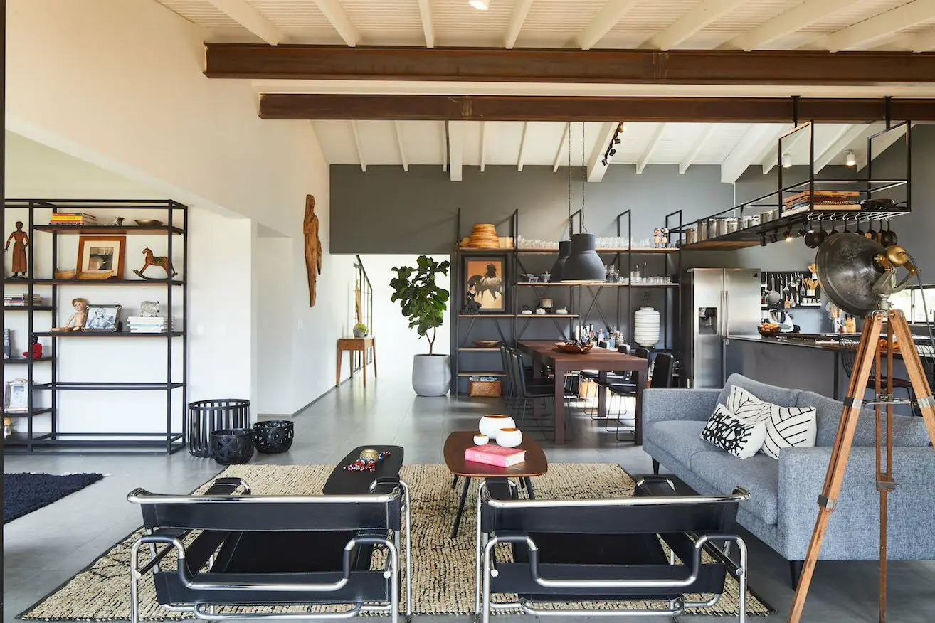 El arquitecto demolió la totalidad de los muros de la zona social de esta casa en Manizales con el fin de generar una estancia abierta para la cocina. Al hacer esto fue necesario soportar la cubierta con vigas nuevas de acero, las cuales quedaron expuestas al atravesar el área liberada y cuyo acabado oxidado contribuye al aspecto industrial del proyecto.