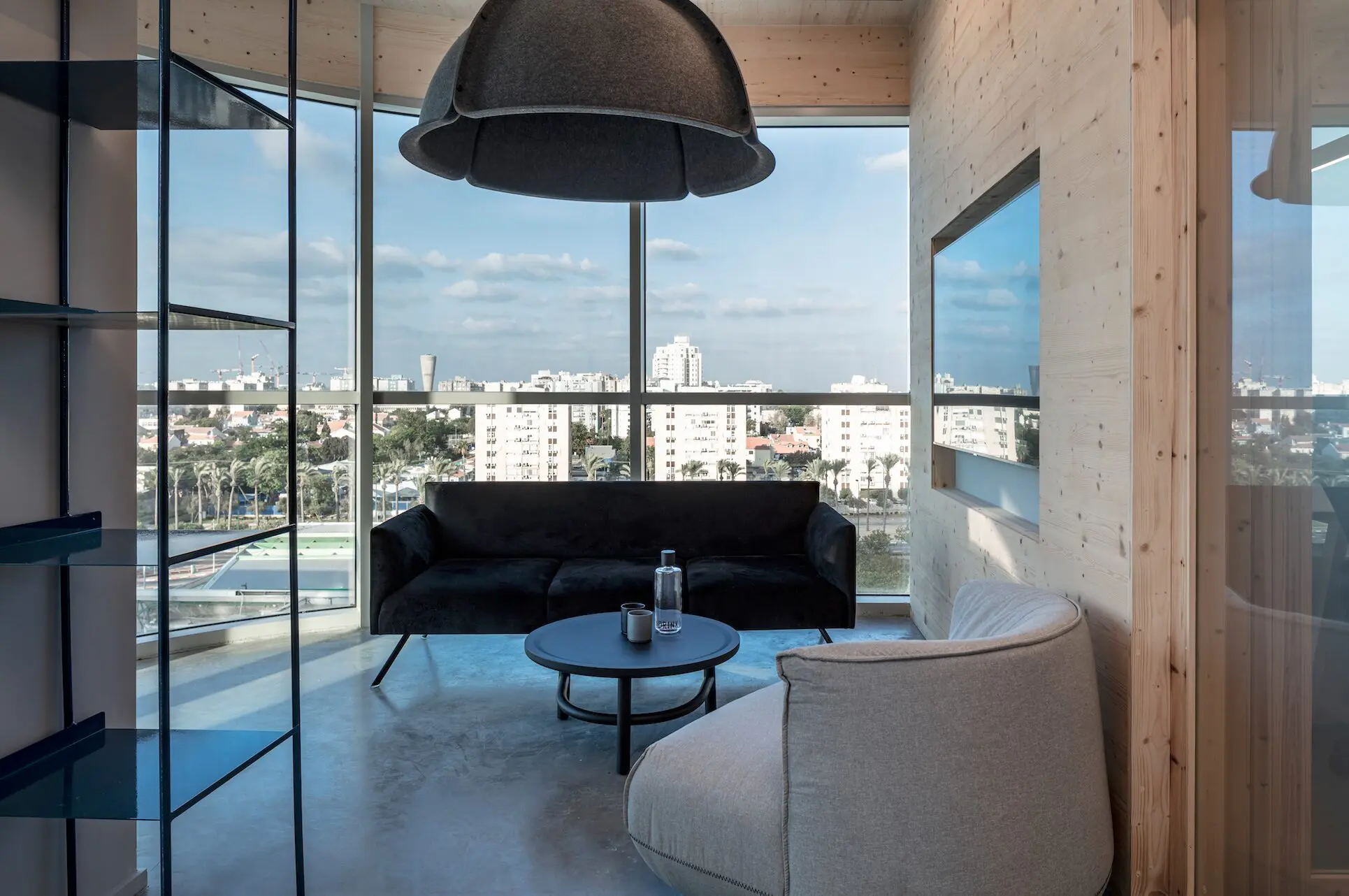 El objetivo era diseñar un entorno de esquí dentro del espacio de la oficina que contrasta completamente con el clima seco del desierto de sus alrededores israelíes, presentando una realidad alternativa al mundo exterior.