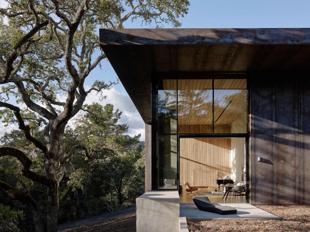 El programa de tres habitaciones partió de la remodelación de una casa campestre construida en 1954, al pie de una colina junto a un arroyo. Al determinar que la estructura y los suelos existentes no eran los adecuados, los arquitectos decidieron reutilizar la huella para aprovechar la sombra del roble que había crecido cerca de la vivienda.