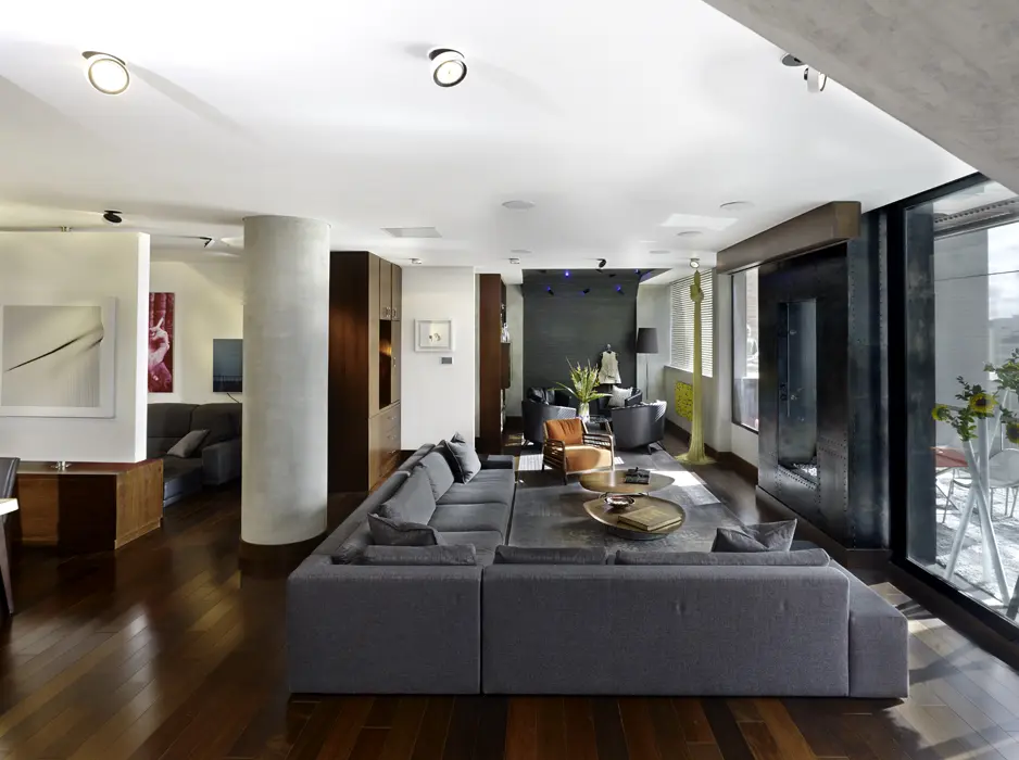 En la zona de la sala un sofá modular permite cerrar este ambiente y volcar la atención al punto central de esta: una chimenea de gas forrada con láminas metálicas que emula el fuselaje de un avión.