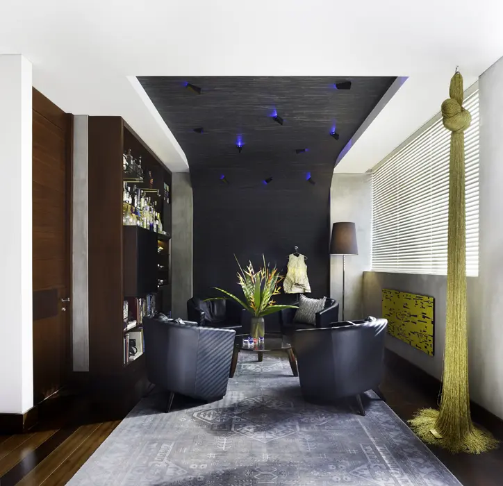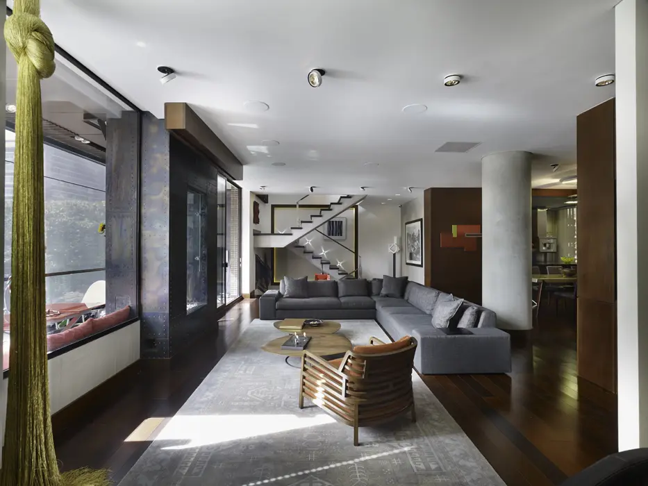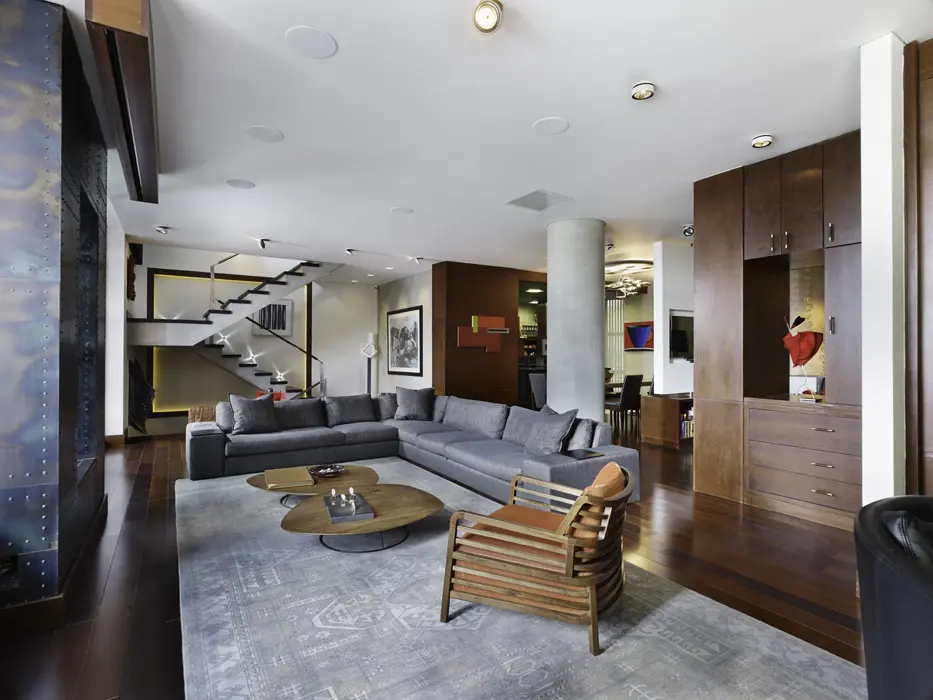 Para este proyecto, Lian concibió una acertada relación espacial y una selección minuciosa de los acabados. El propósito consistía en generar mayor amplitud a través de espacios correctamente integrados y de utilizar materiales de calidad como el sapán –que se usó en toda la carpintería–, el microcemento –desarrollado por el equipo para dar una exclusiva textura a algunas paredes–, el cuero importado –para los escalones de la escalera y la pared del bar–, y la madera brasilera –para el piso de la zona social–.