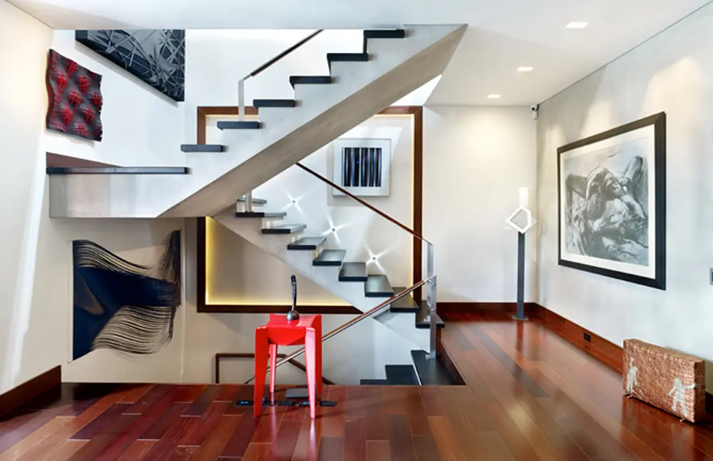 Para lograr cierta unidad estética en una casa de grandes dimensiones, la curaduría de las obras se basa en el interiorismo que Lian y su equipo proyectaron: “Hicimos el desarrollo de cómo debería ir para que hiciera parte de la arquitectura. Conseguimos un área llena de detalles, donde nada es estándar”, afirma.