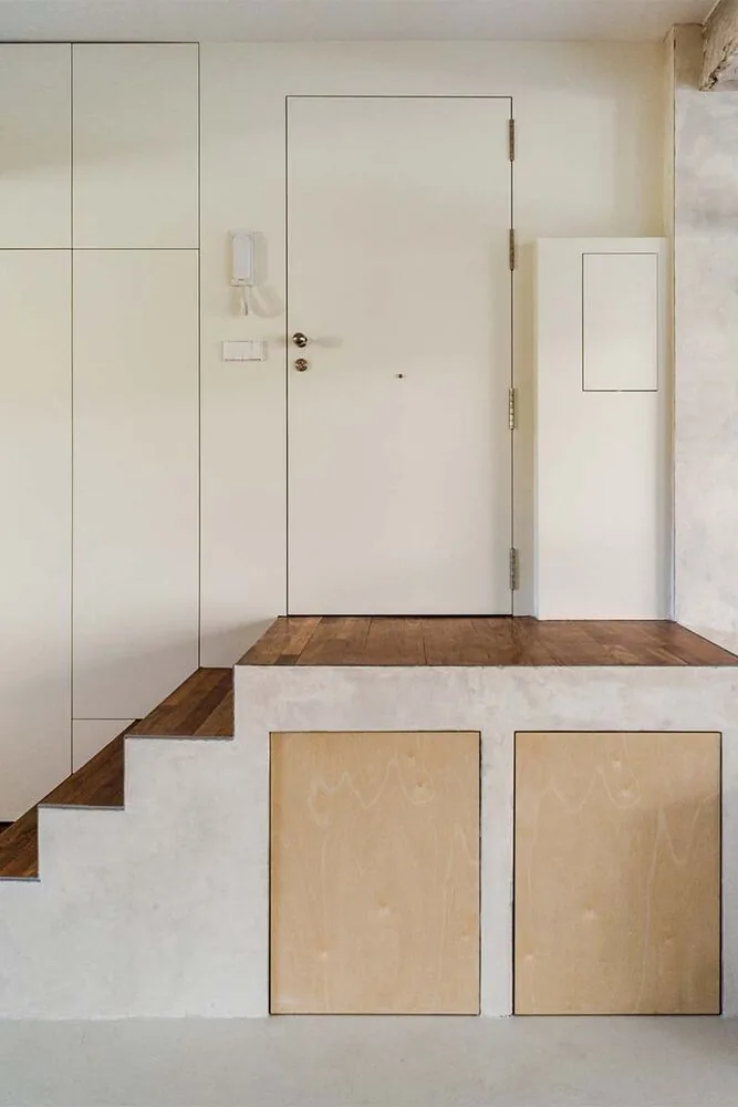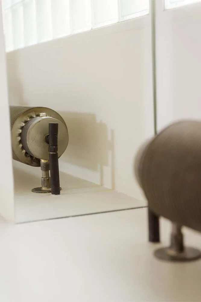 El pavimento existente, recuperado y reinstalado, refuerza el carácter general del espacio, complementado por la solidez de la piedra caliza en el baño y la elegancia del acero inoxidable en la cocina y la barandilla. El pavimento continuo de mortero autonivelante unifica el espacio, creando una base neutra que potencia la fluidez y la luminosidad, acentuada aún más por los espejos en los marcos de las ventanas de bloques de vidrio.