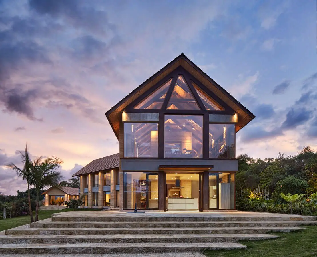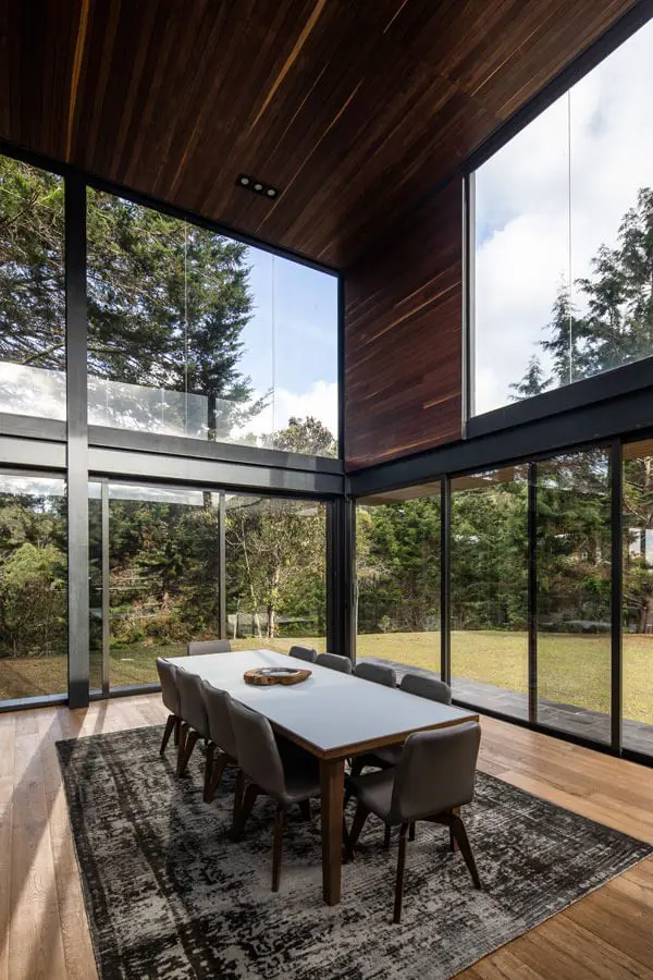 Los grandes ventanales de vidrio y la doble altura del comedor de esta casa, ubicada en Antioquia y diseñada por la firma Llano Arquitectos, permiten que el exuberante paisaje sea parte del interiorismo y de la arquitectura. Se podría decir que la naturaleza es la encargada de dar el color.