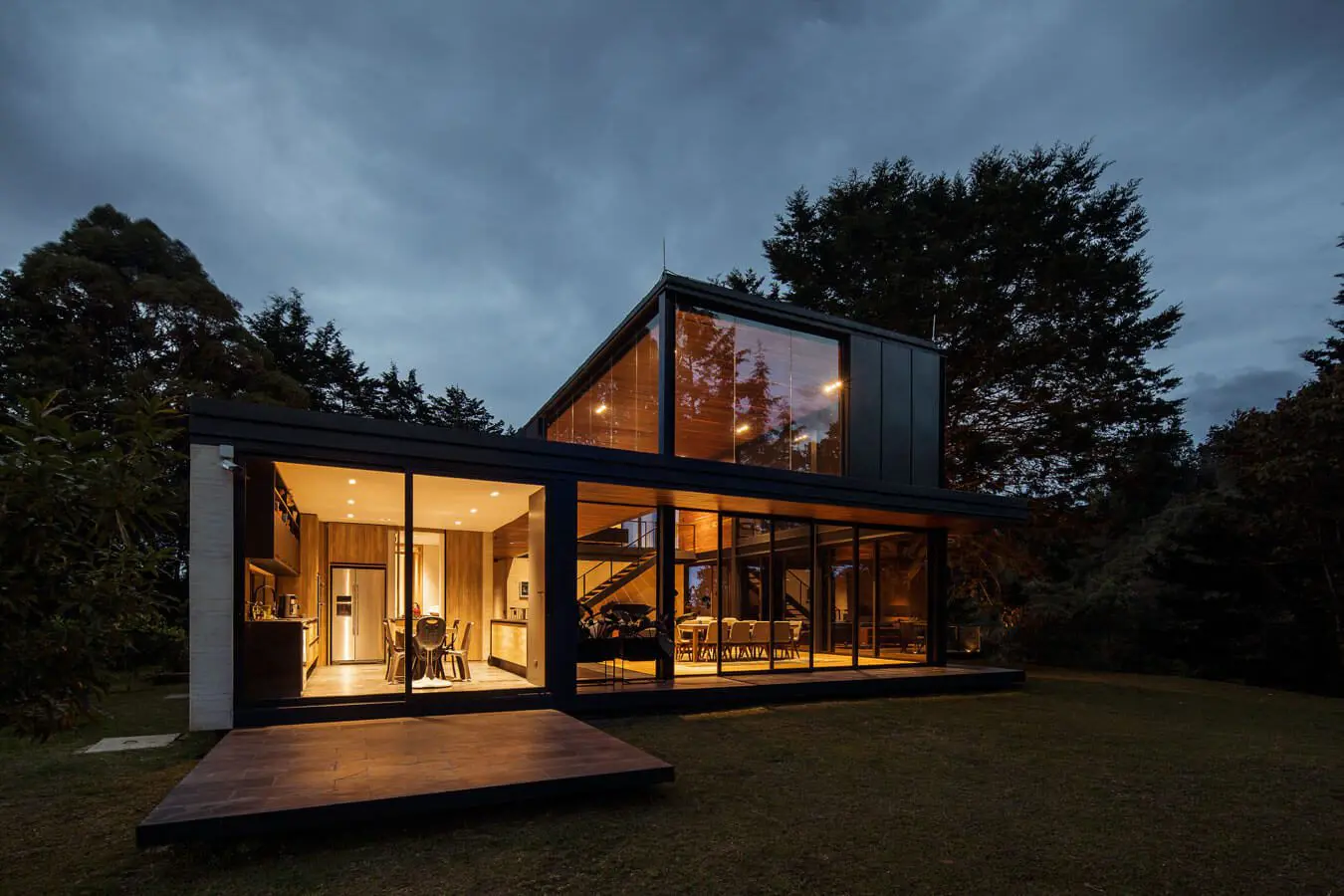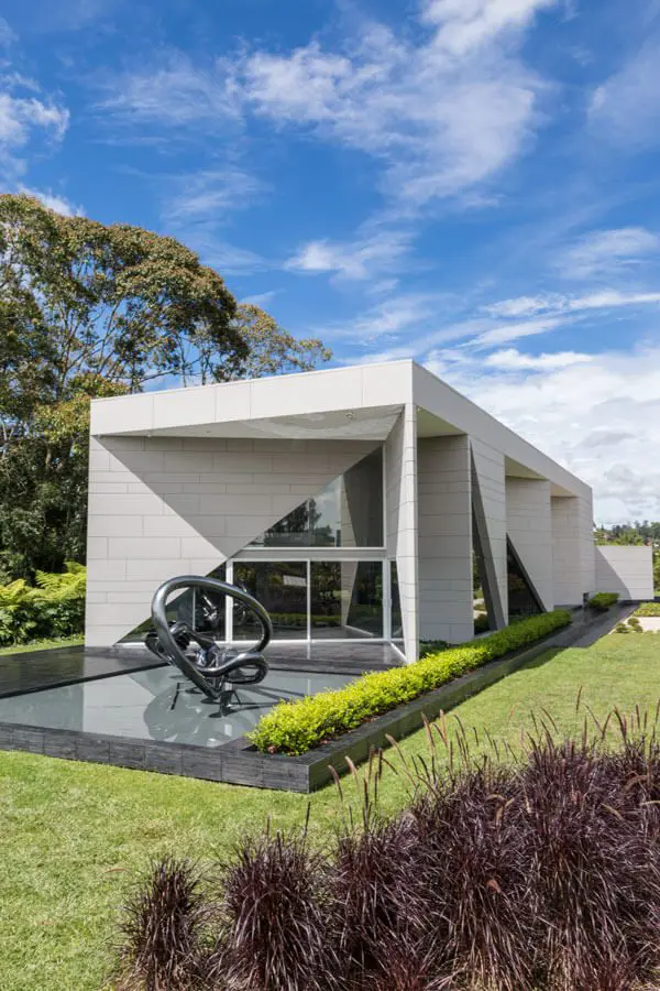 Como una pieza de origami de gran formato, la casa se asienta junto a un pequeño grupo de árboles. Los cortes en su fachada permiten que el vidrio revele un poco lo que pasa en su interior. Su diseño arquitectónico estuvo a cargo del antioqueño Javier Vera.