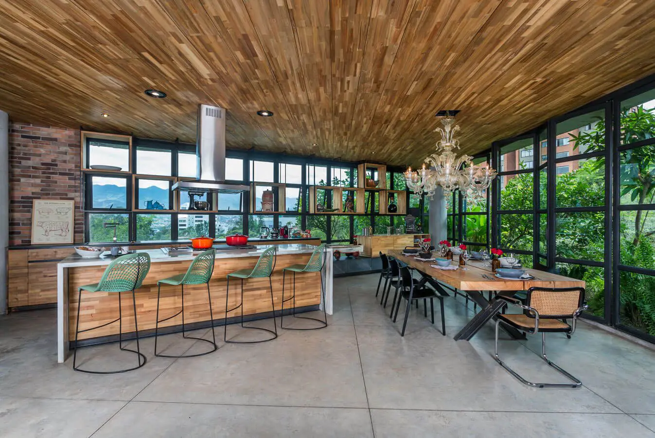 La cocina y el comedor de este apartamento en Medellín, con interiorismo del arquitecto Mauricio Patiño y ubicado en el edificio El Matorral, tienen como telón de fondo la densa vegetación que hace parte de la estructura gracias a los ventanales de piso a techo con estructura metálica.