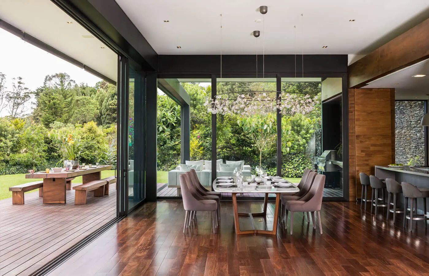 Cocinar, comer y disfrutar del jardín es posible gracias a la transparencia y apertura de las fachadas acristaladas de esta casa, ubicada en Medellín y diseñada por los arquitectos Camilo Mejía y Luis Javier Porto, de la firma Grupo Q, y construida por Q Constructora.