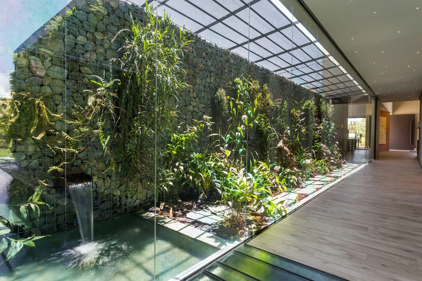 La luz del día baña el corredor de esta casa en Antioquia, diseño de Juliana y Sebastián Vallejo, y Luis Ignacio Franco, arquitectos del estudio IM3D Arquitectura. Acá un jardín vertical con fuente incluida acompaña todo el recorrido, protegido por una pared de vidrio.