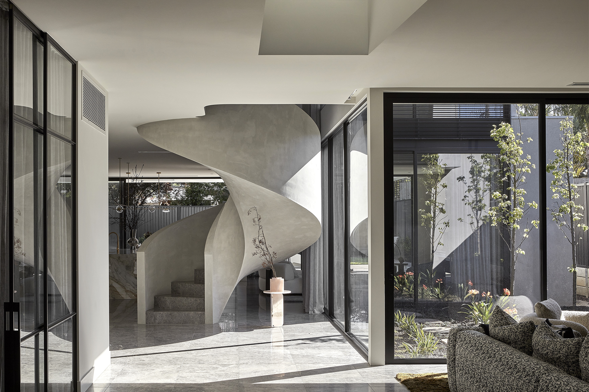 Esta vivienda, con una escalera escultórica como eje central, articula espacios que invitan tanto al encuentro como al retiro, en un ejercicio de arquitectura que privilegia la luz, la proporción y la fluidez espacial.