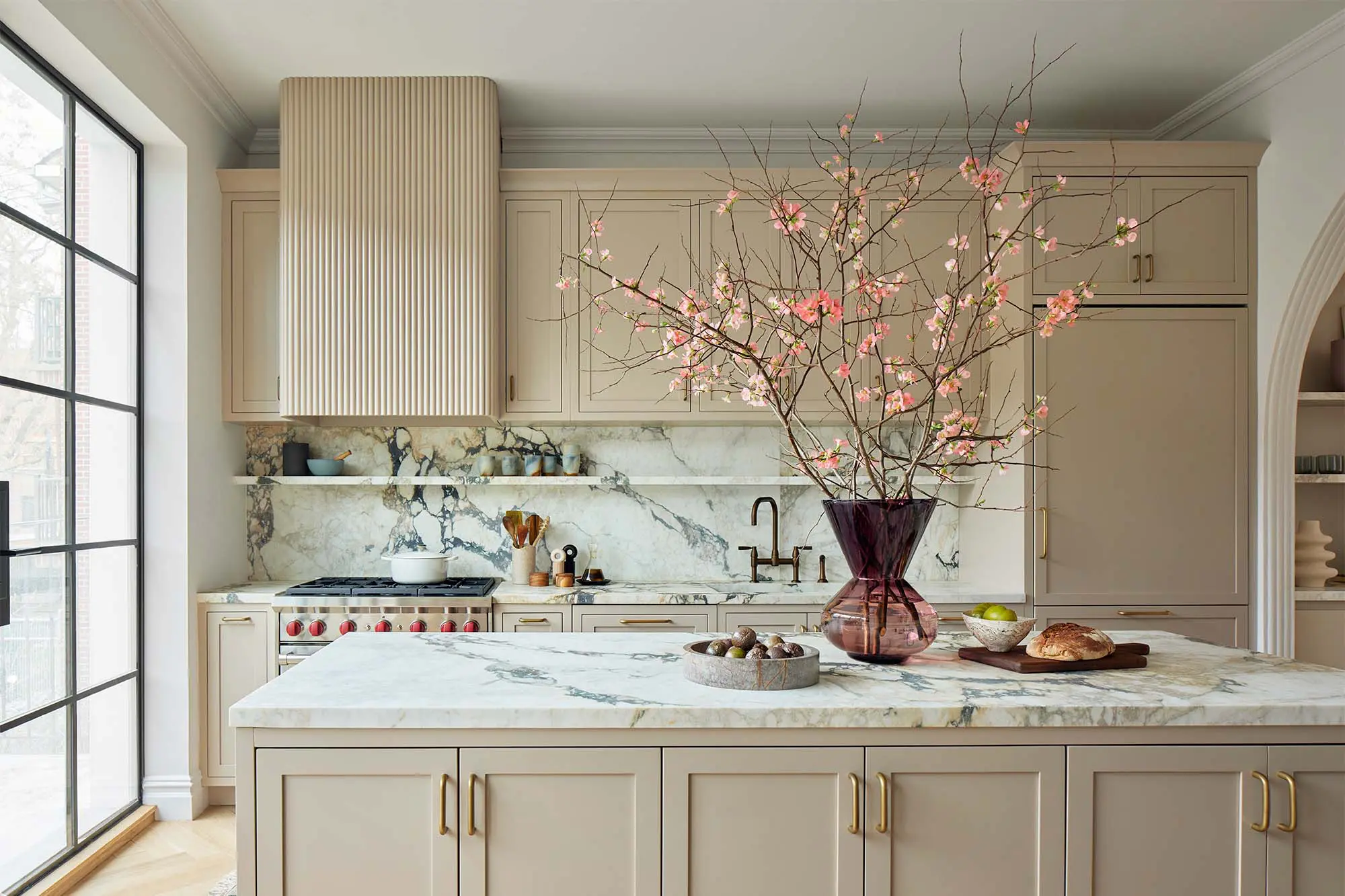 El mármol Calacatta Vagli Viola encierra los gabinetes hechos a la medida —de corte muy clásico— y, además, se utiliza como tapa para la isla. En el otro extremo, un armario de despensa con un remate curvo flanquea una mesa de comedor de roble claro y sillas tapizadas, mientras que un trío de luminarias de vidrio soplado se cierne sobre el techo. Tanto la cocina como la isla y el comedor se enfrentan a un gran ventanal de piso a techo, que conecta con el exterior.