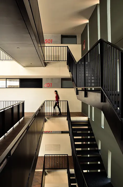 La lluvia, el viento, el sol y el murmullo de la ciudad suben por sus escaleras, cruzan sus puentes y habitan el gran patio. El proyecto y el paisaje se mezclan en el vacío. El cuerpo sinuoso de este edificio de seis pisos de altura persigue la geometría de la calle mientras sus fachadas de concreto blanco son salpicadas por ventanas y balcones en un ritmo intermitente. La calidad de sus materiales y el rigor constructivo del proyecto destacan su figura en el fondo urbano.