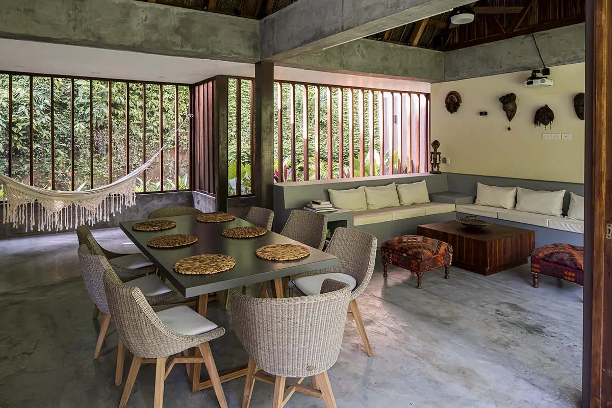 En esta casa, ubicada a orillas del río Mendihuaca, en el departamento de Magdalena, se juntan dos arquitecturas: una que remite a las técnicas locales y otra que se vincula con la tradición moderna. Diseñada para una pareja que pasa temporadas en el país, la construcción ocupa un claro alargado dentro del boque tropical de esta región turística.