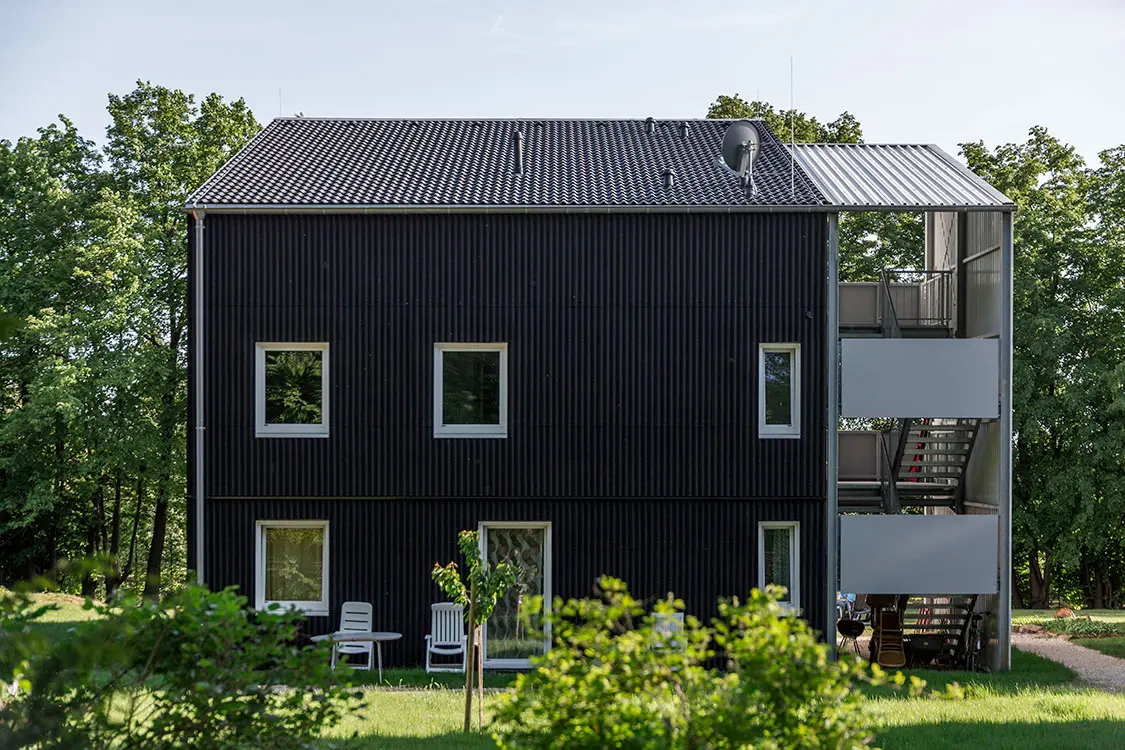 El objetivo principal de los arquitectos consistía en crear viviendas que fueran una plataforma para que las personas pudieran integrarse a la sociedad alemana. Por eso, diseñaron tres unidades de tres pisos, idénticas en su estructura, pero cada una rotada 90 grados frente a su predecesora para que el techo a un agua generara la sensación de ser única, distinta. Además, esta rotación permite que las escaleras de acceso se vinculen con el parque, espacio que busca la interacción de sus habitantes con la población local.