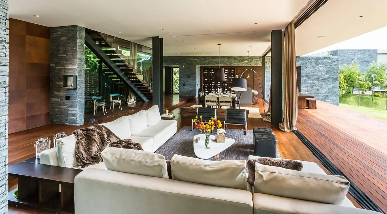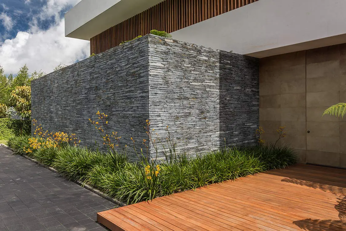 El ingreso se da por medio de dos grandes muros de piedra negra. El de la derecha contiene la zona de servicios, el gimnasio y el garaje. El otro, un patio interior y el baño social. Además, estas grandes cajas enmarcan una imponente puerta pivotante, de 2,70 por 3,20 metros, cubierta con cuero para que “con el tiempo se desgaste, y envejezca como una silla de montar.