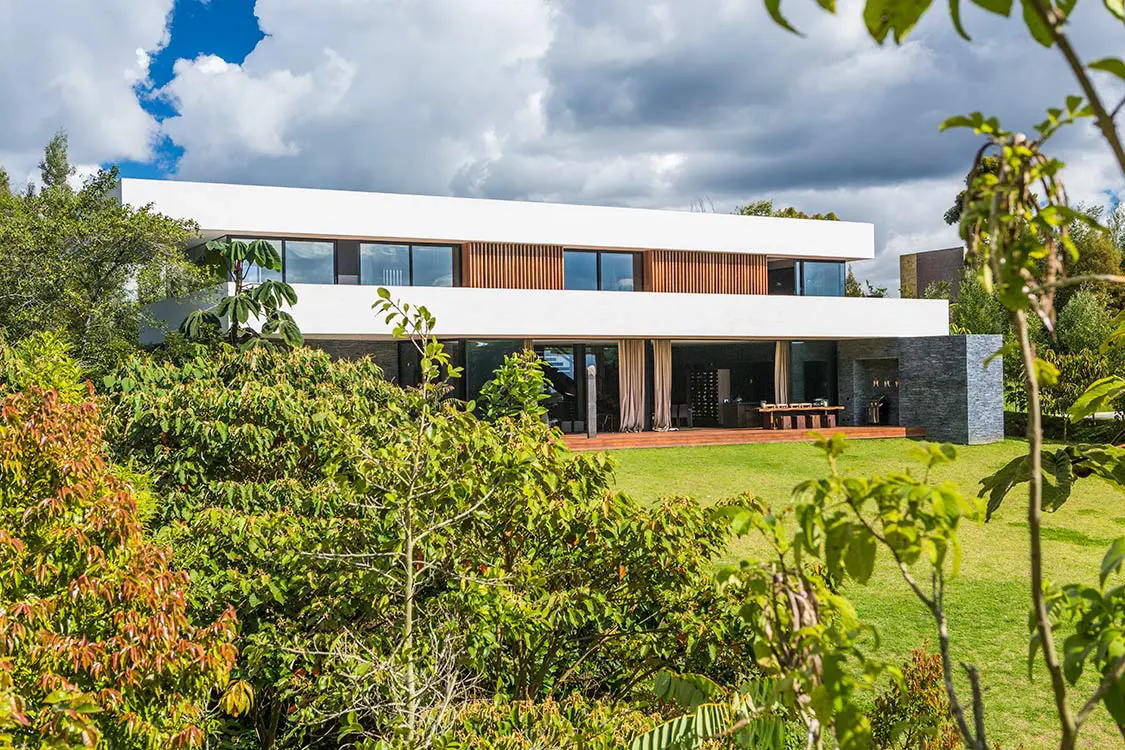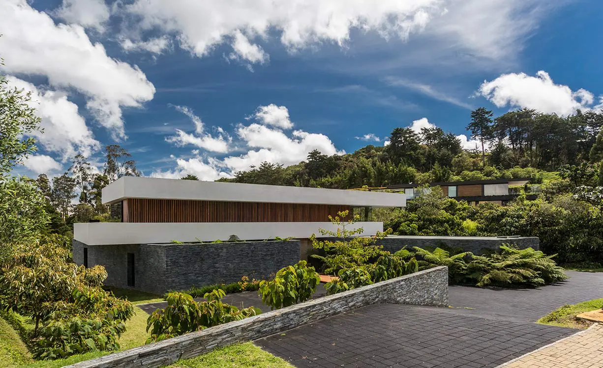 A lo lejos, desde la vía de la urbanización, la fachada frontal de la casa se percibe cerrada y aislada, pero sobresale por medio de acertados conceptos arquitectónicos, como el desplazamiento en el segundo nivel de dos líneas gruesas y blancas, lo cual crea a la derecha –donde está el family room– una vista de 180 grados sobre el bosque nativo, visual protegida del sol por un voladizo.