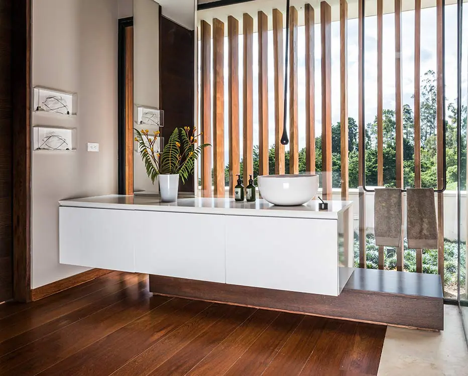 En la zona social se evidencia que la fachada posterior es lo opuesto a la frontal, aquí el vínculo con el bosque nativo es absoluto. Las puertas de vidrio de piso a techo se abren casi por completo para vincular este ambiente con el deck. “Es una gran galería. No soy de espacios cerrados e independientes, quería todas las actividades integradas, solo la cocina un poco separada, por eso se me ocurrió poner una división que por un lado tuviera una cava, y por el otro, almacenamiento”.