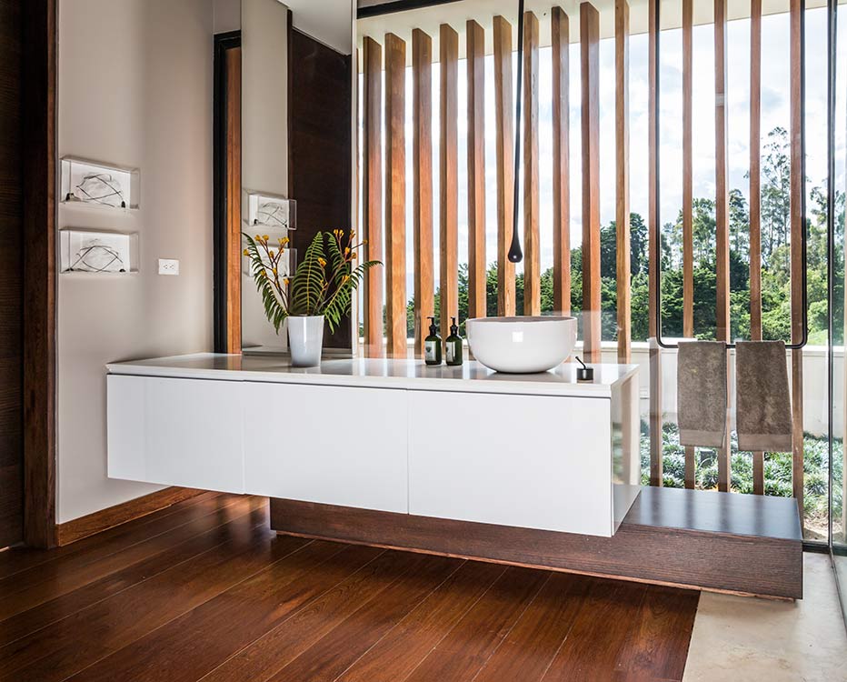 A lo lejos, desde la vía de la urbanización, la fachada frontal de la casa se percibe cerrada y aislada, pero sobresale por medio de acertados conceptos arquitectónicos, como el desplazamiento en el segundo nivel de dos líneas gruesas y blancas, lo cual crea a la derecha –donde está el family room– una vista de 180 grados sobre el bosque nativo, visual protegida del sol por un voladizo.