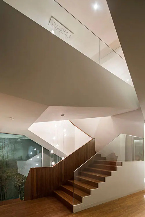Es así como en esta fachada, hecha en piedra arenisca de tono habano traída del norte de España y en piedra gris italiana, la única parte que podría considerarse abierta es la celosía de acero inoxidable ubicada a un costado de la entrada. Esta propuesta surgió para solucionar el chaflán que presentaba el lote de forma rectangular: “Nuestra idea era crear un elemento que fuera una secuencia de pliegues, que diese un movimiento a todo ese espacio y que rompiera el chaflán, que no lo hiciera tan visible”. Así mismo, para mantener la privacidad, las aberturas de este objeto están calculadas para que las personas observen el exterior sin ser vistas, a este fin se suma un jardín tanto exterior como interior.